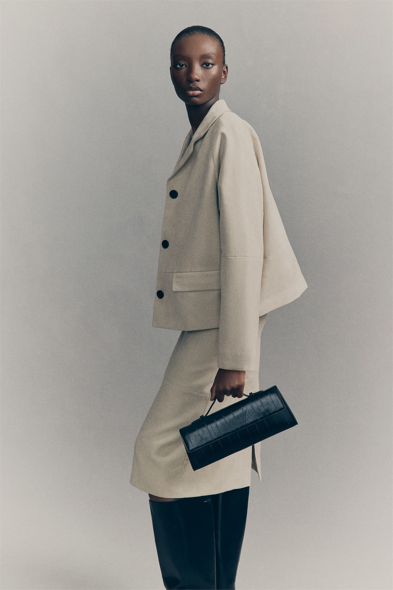 Пиджак из тканого материала с мягкой ворсистой отделкой. Лацканы с вырезом, пуговицы спереди и накладные передние карманы. На подкладке.