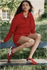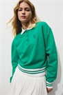 Короткая рубашка-поло свободного покроя из легкой толстоватой ткани с воротником и застежкой на пуговицы. Спущенные плечи и длинные рукава с окантовкой на манжетах и подоле.