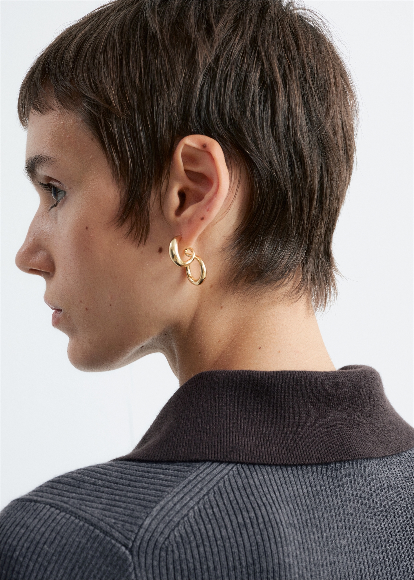 Серьги изготовлены из полированной латуни и имеют слегка неровную проволоку, образующую два обруча — один классический, обращенный вбок, и один, обращенный вперед. При ношении они создают взаимосвязанный вид, напоминающий подвеску. Проверено никелем Застежка-бабочка Общая длина: 3 см / 1,2” Ширина в самом широком месте: 1,6 см / 0,6” Глубина: 1,8 см / 0,7”