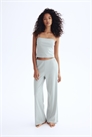 Пижама с верхней частью на бретелях и нижней частью из мягкого ребристого трикотажа. Верх на бретелях с прямым вырезом, отделанным пико, и декоративным атласным бантиком спереди. Нижние трусы с эластичным материалом, отделкой пико на талии и прямыми ножками.