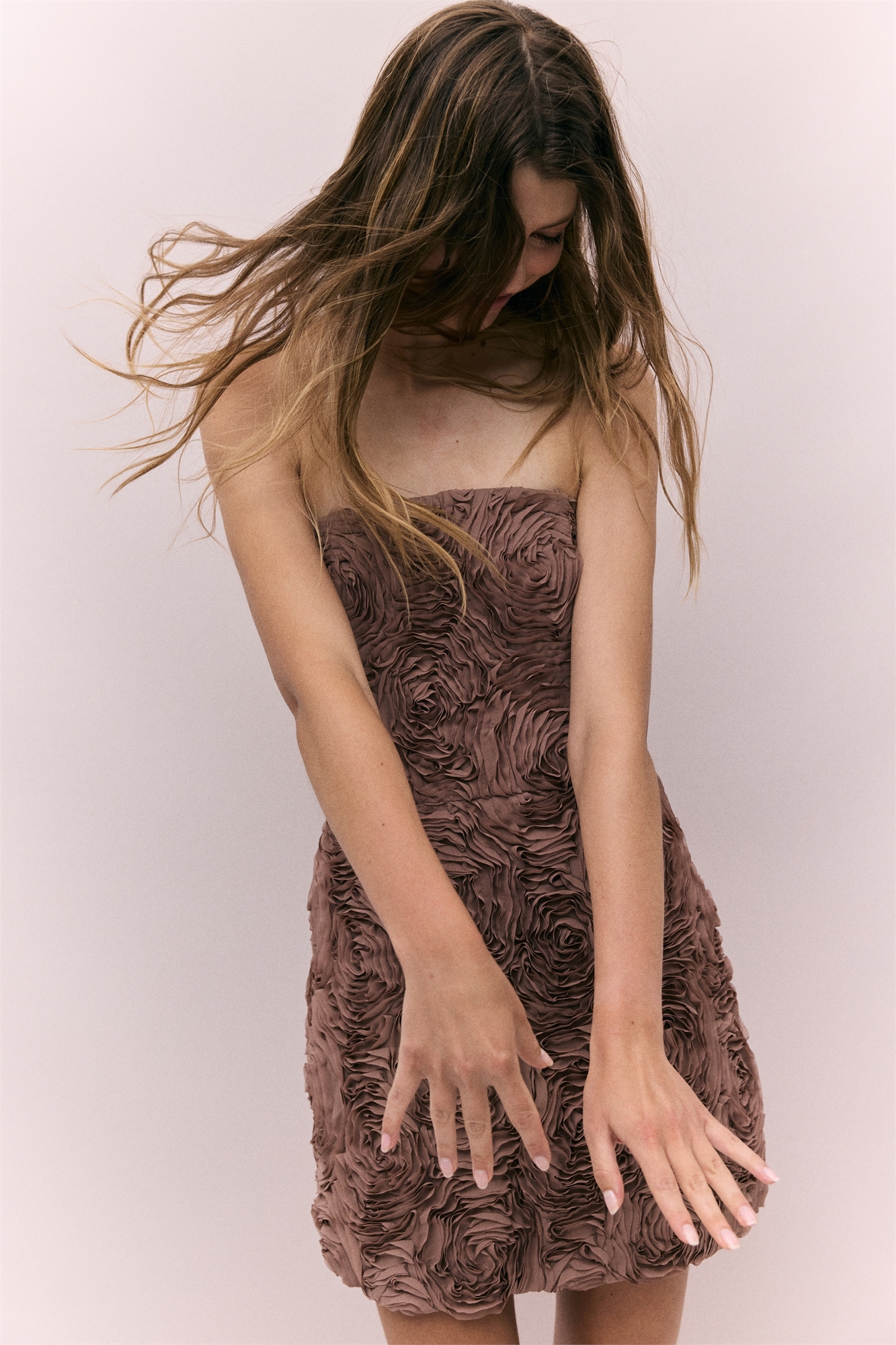 Облегающее платье-бандо мини из тканого материала с цветочными аппликациями по всей поверхности. Скрытая силиконовая отделка в верхней части и бонирование спереди и сзади для придания формы и поддержки. Скрытая застежка-молния и застежка-крючок сзади. На подкладке.