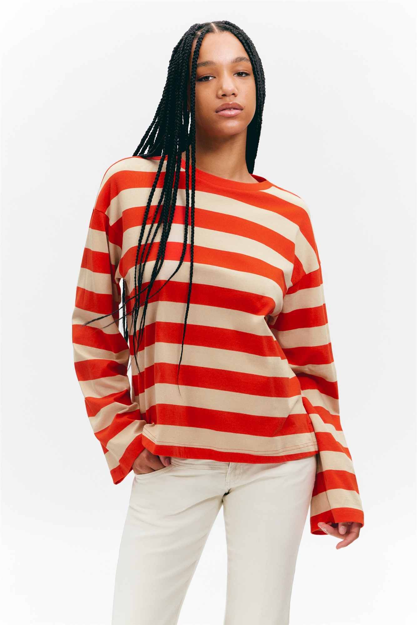 Футболка с длинными рукавами, непринужденный силуэт и повседневная легкость. Изготовленная из мягкого хлопкового джерси, она имеет классический вырез с ребристой отделкой, слегка опущенные плечи и тонкие боковые разрезы на подоле.