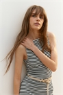 Приталенное платье длиной до колен из мягкого ребристого джерси, без рукавов и с изящным вырезом-лодочкой.