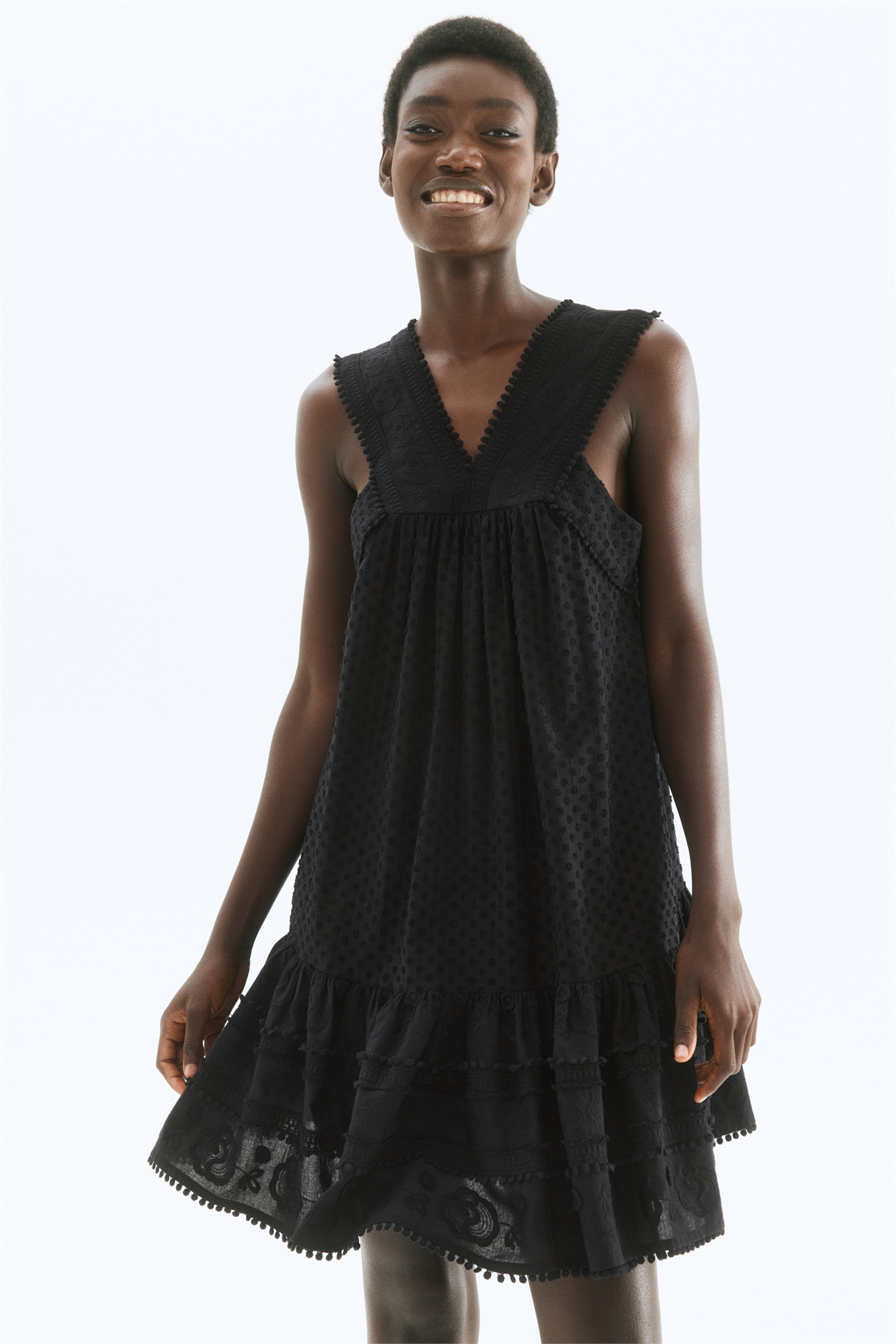 Короткое платье свободного покроя из хлопкового полотна, украшенное тональной вышивкой и декоративными помпонами. Широкие бретели, сходящиеся спереди, и отверстие для ключа со скрытыми пуговицами сзади. Сборки в верхней части и сборчатый шов над подолом для придания дополнительного объема. Подкладка из хлопкового вуаля.