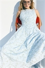 Платье длиной до колен без рукавов из хрустящего хлопкового поплина с круглым вырезом, открытой спиной с завязками в верхней части и застежкой-молнией ниже талии. Облегающий лиф и расклешенная юбка со складками на бедрах для придания объема. На подкладке.