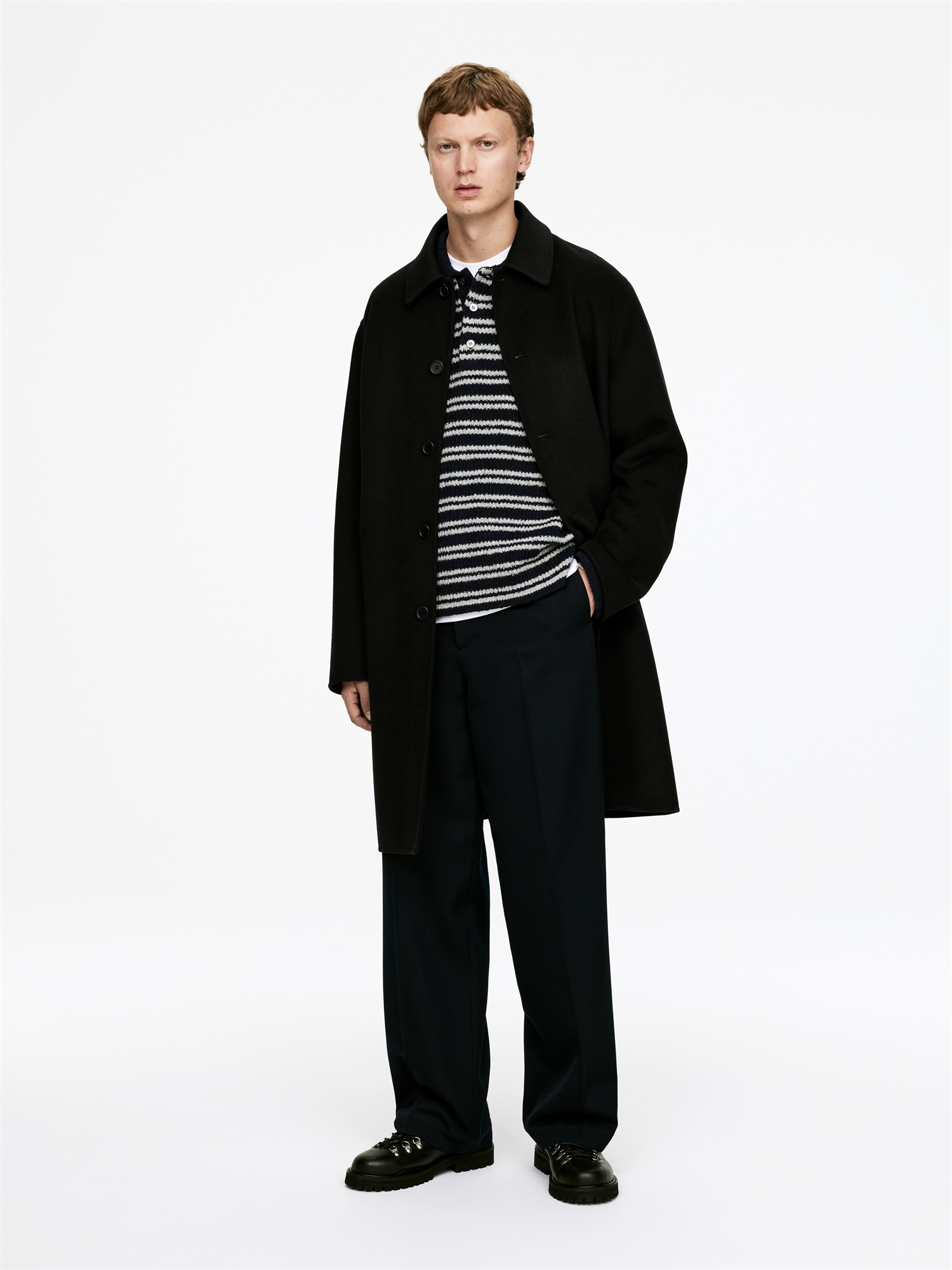 Пальто из шерстяной ткани с двойной лицевой поверхностью. Модель имеет непринужденный крой. С отложным воротником, застежкой на пуговицы и косыми передними карманами. Шлица сзади. Изделие содержит 100% шерсти RWS (TE-00047206). Продукция, сертифицированная по стандарту ответственной шерсти (RWS), содержит шерстяное волокно с ферм, прошедших независимую сертификацию на соответствие требованиям по благополучию животных и землепользованию.