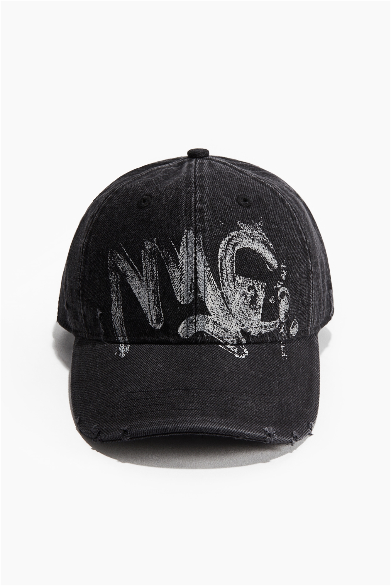 Кепка из хлопковой саржи с изношенными деталями, принтом, вышитыми люверсами и регулируемой застежкой на крючок и петлю сзади. Хлопковый потник.
