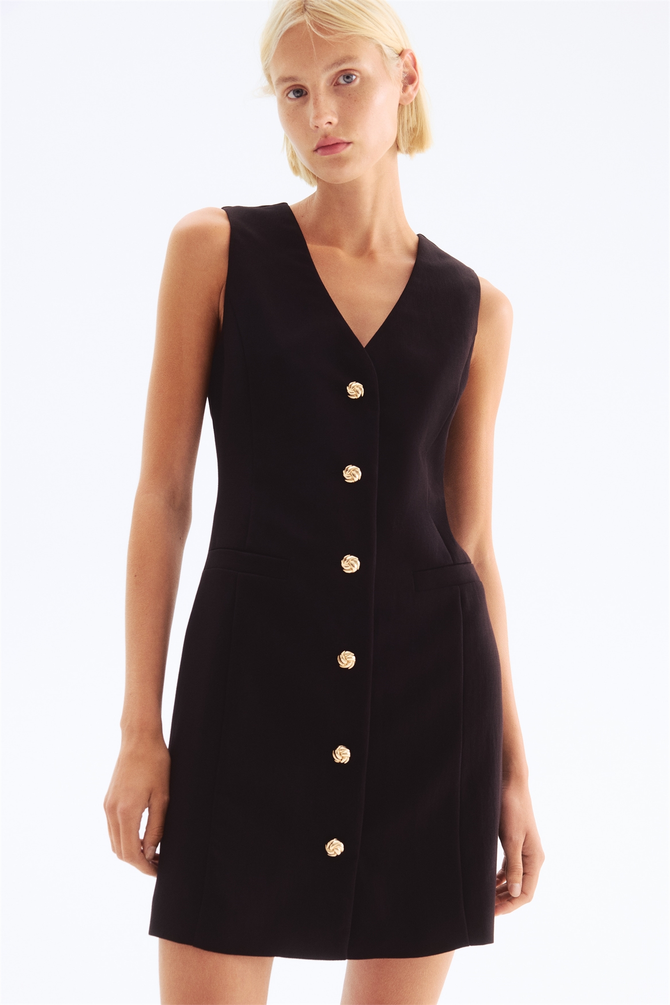 Короткое платье без рукавов из тканого материала с глубоким V-образным вырезом и металлическими пуговицами в виде узлов спереди. Поддельные карманы спереди и формирующие швы спереди и сзади для придания силуэту привлекательности. На подкладке.