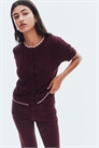 Короткий кардиган мягкой вязки "косы" из смеси хлопка. Круглый вырез, застежка на пуговицы спереди и короткие рукава. Окантовка контрастного цвета вокруг выреза, на манжетах и подоле.