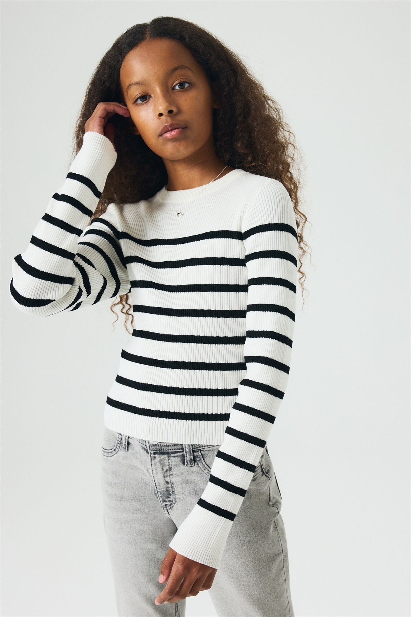 Джемпер из мягкого трикотажа в рубчик. Круглый вырез с ребристой отделкой, длинные рукава и прямой подол.