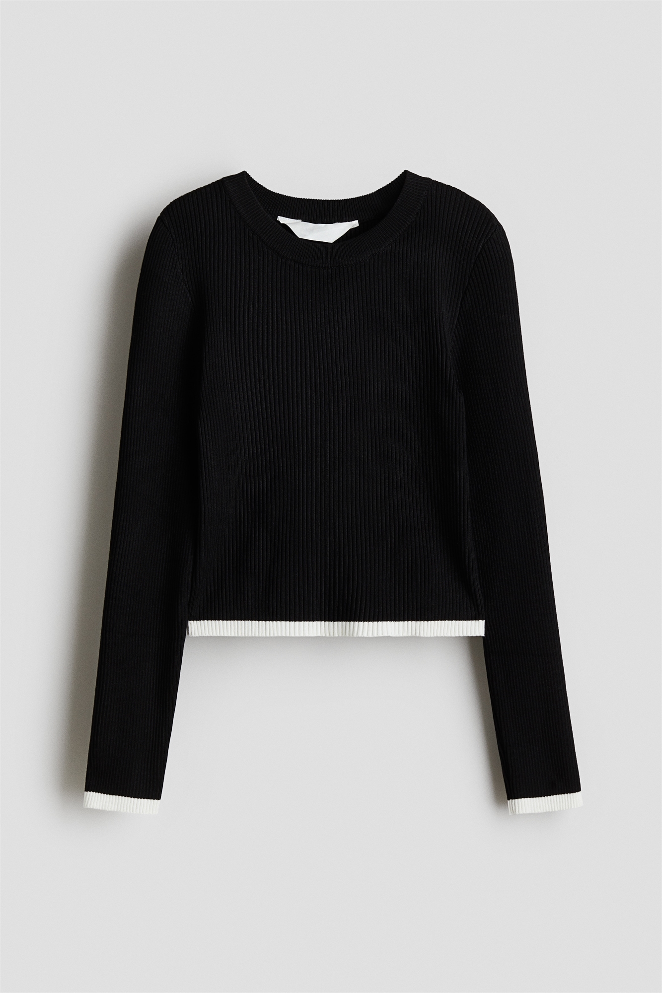 Джемпер из мягкого трикотажа в рубчик. Круглый вырез с ребристой отделкой, длинные рукава и прямой подол.