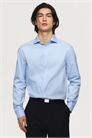 Рубашка из хлопкового полотна с отложным воротником, французским передом, ярмом сзади и закругленным подолом. Длинные рукава с регулируемыми пуговицами на манжетах и рукавной планкой с пуговицей. Зауженный крой, облегающий контуры тела и создающий приталенный силуэт.