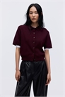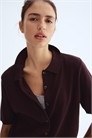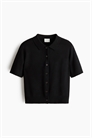 Короткий кардиган из тонкого трикотажа с воротником, пуговицами спереди и короткими рукавами. Ребристые манжеты и подол.