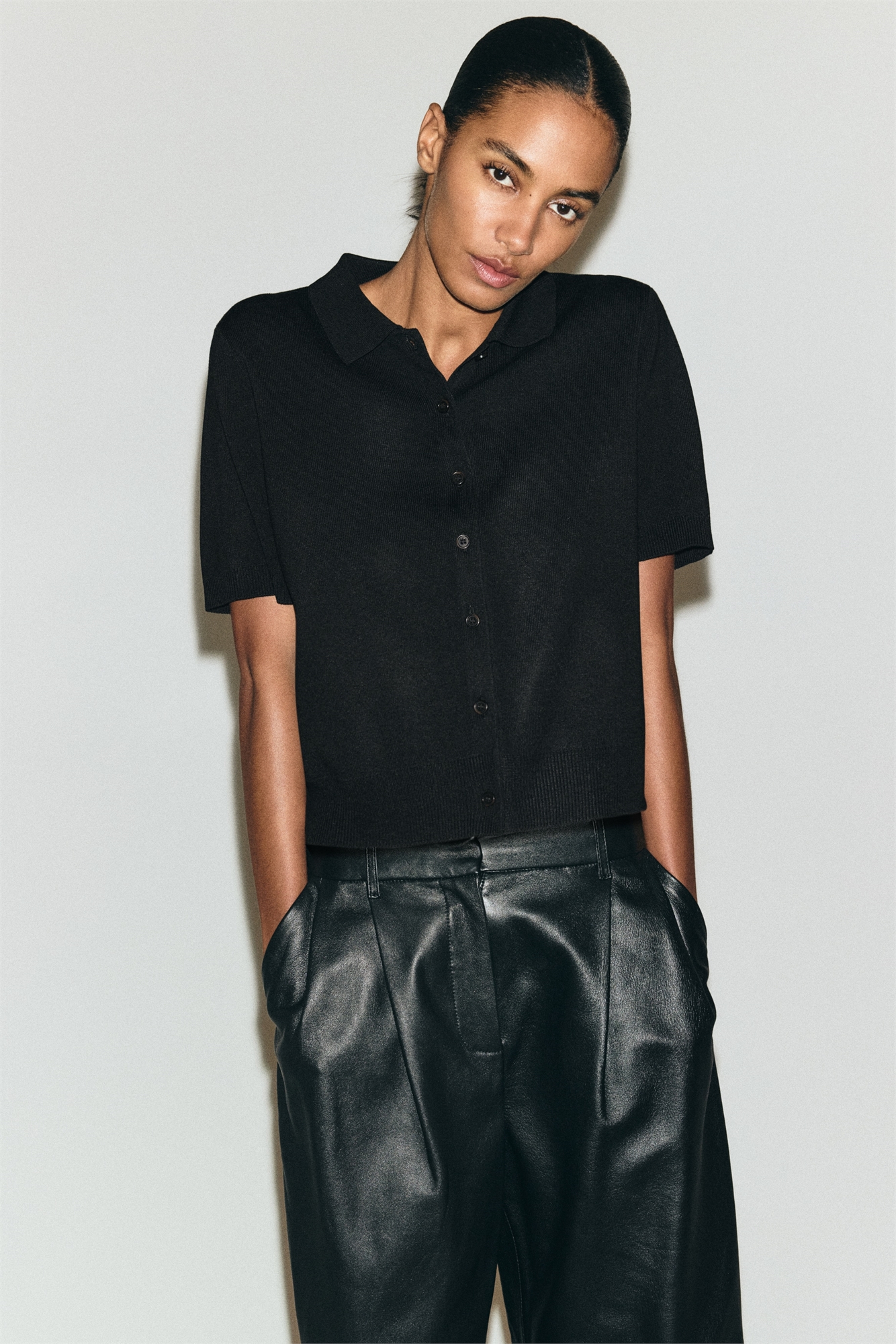 Короткий кардиган из тонкого трикотажа с воротником, пуговицами спереди и короткими рукавами. Ребристые манжеты и подол.