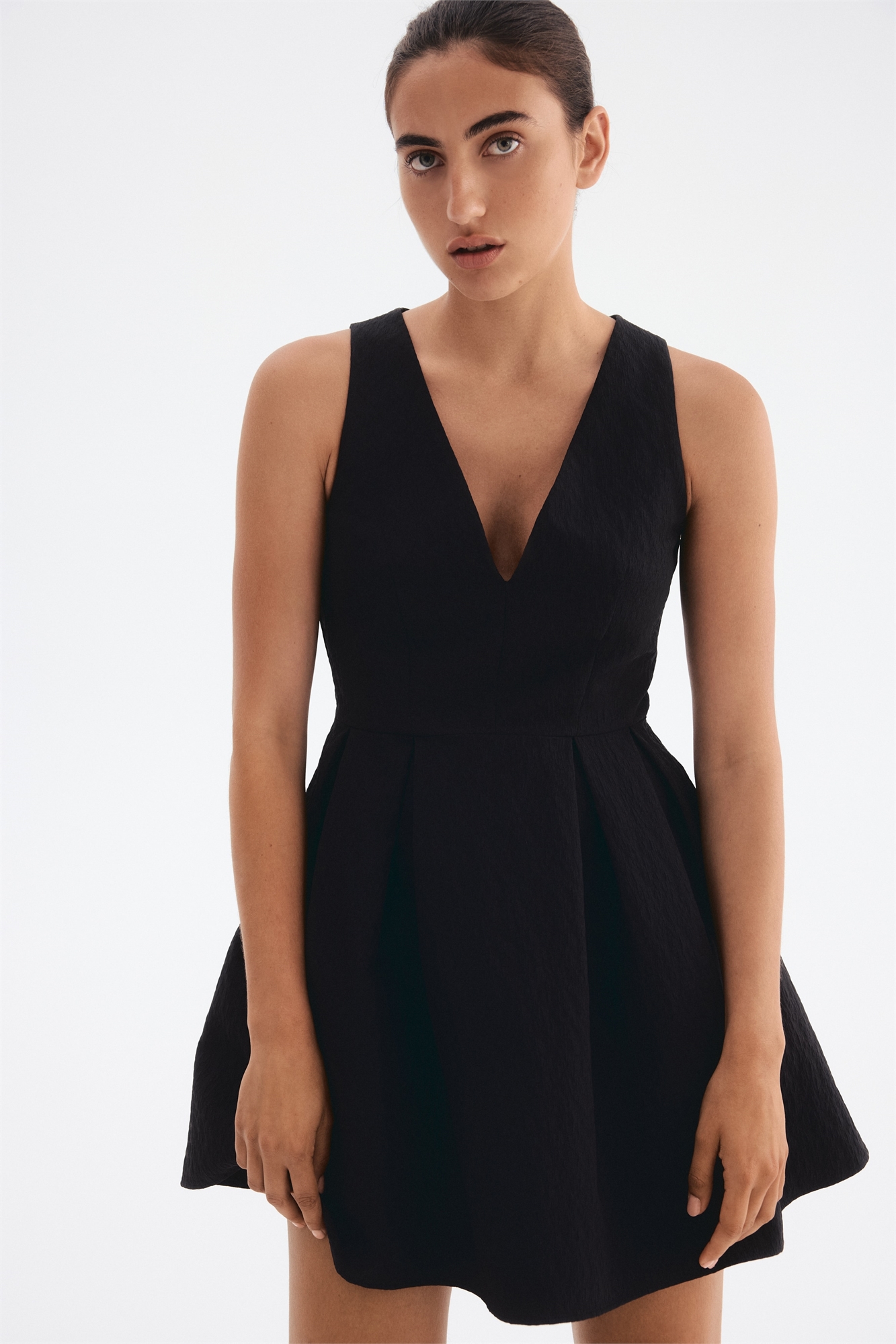 Короткое платье без рукавов из ткани с эффектом "crinkled weave" с приталенным лифом с глубоким V-образным вырезом и потайной застежкой на молнию и крючок-глаз сзади. Расклешенная юбка с перевернутыми складками спереди и сзади для придания объема. Лиф на подкладке.