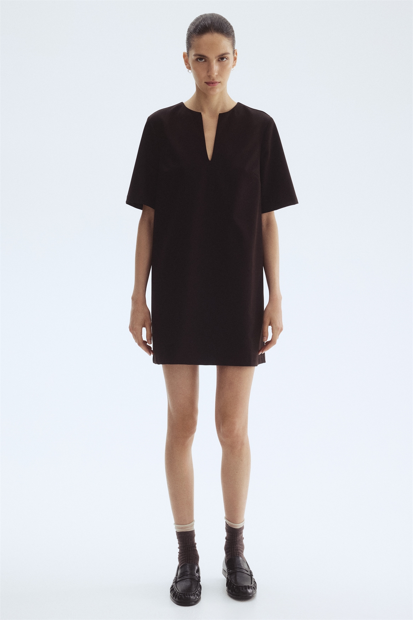 Короткое платье из тканого материала с круглым вырезом, V-образной проймой спереди и короткими рукавами. На подкладке.