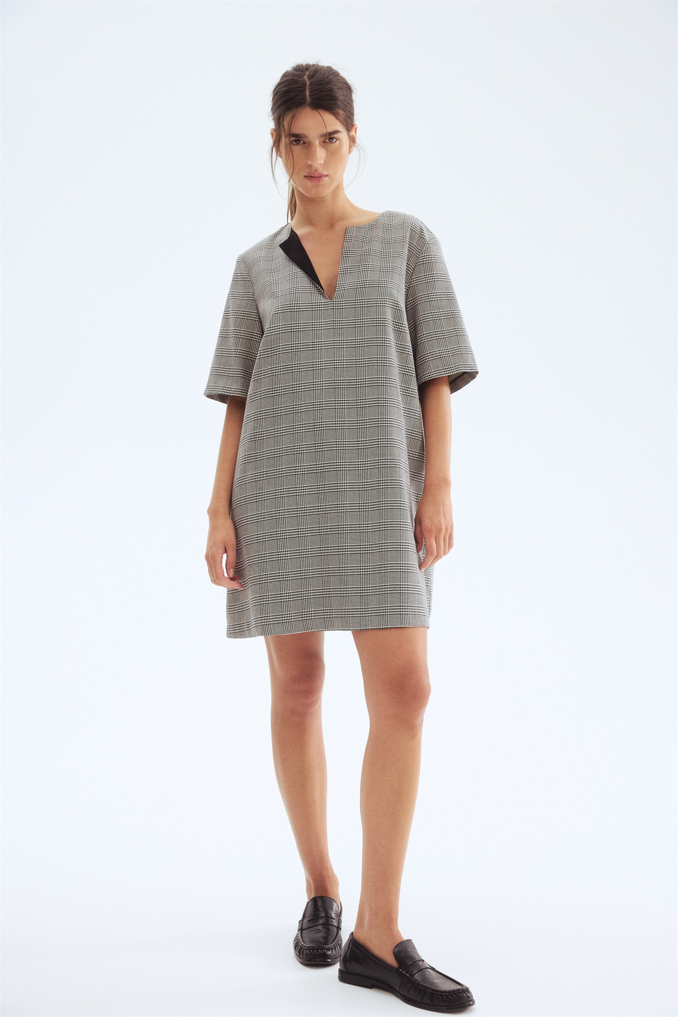 Короткое платье из тканого материала с круглым вырезом, V-образной проймой спереди и короткими рукавами. На подкладке.