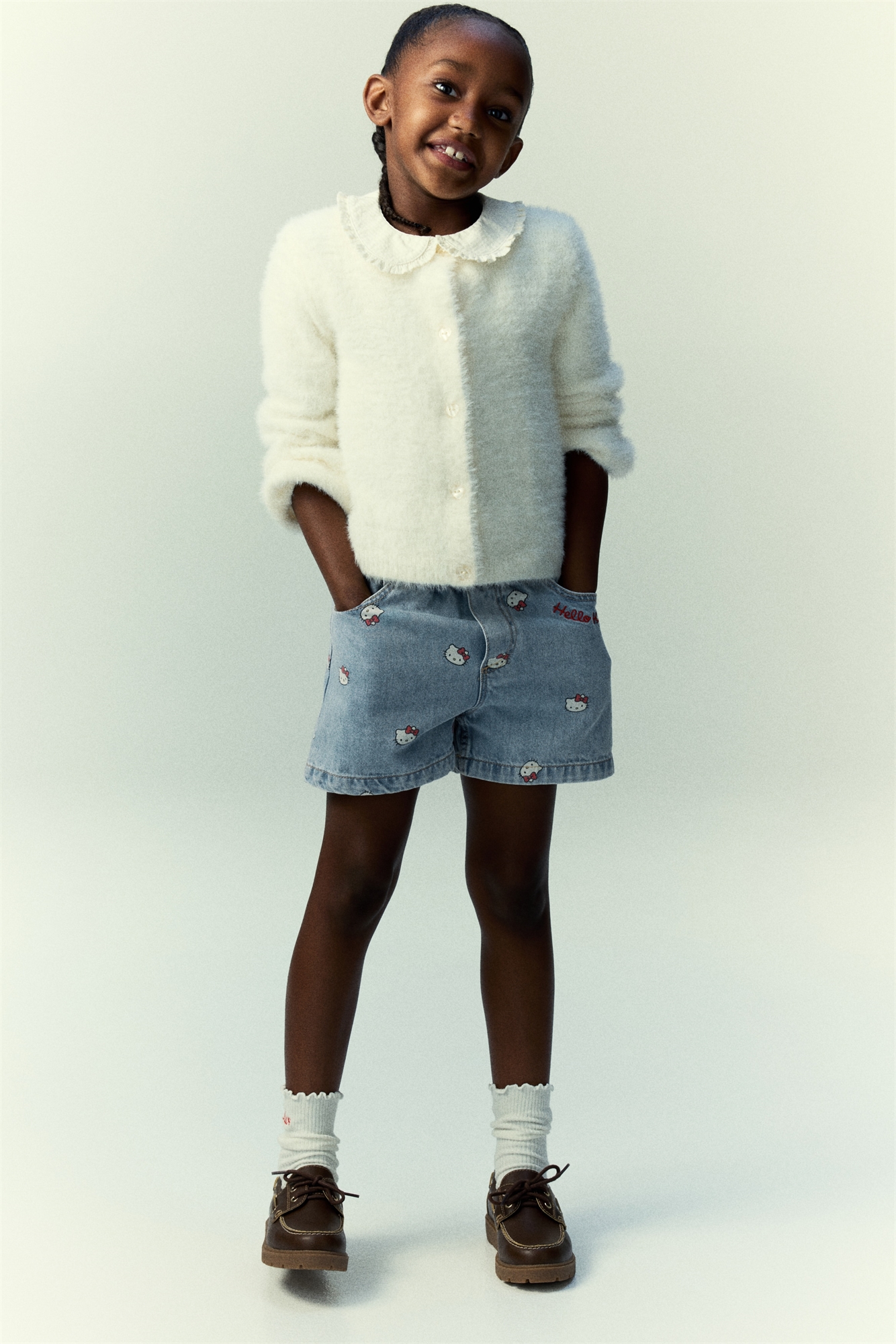Шорты из принтованного хлопкового денима с вышитыми деталями. Регулируемый эластичный пояс из бумажного мешка и фальшивая ширинка с прижимной планкой. Свободный крой. Закругленные карманы спереди и открытые карманы сзади.