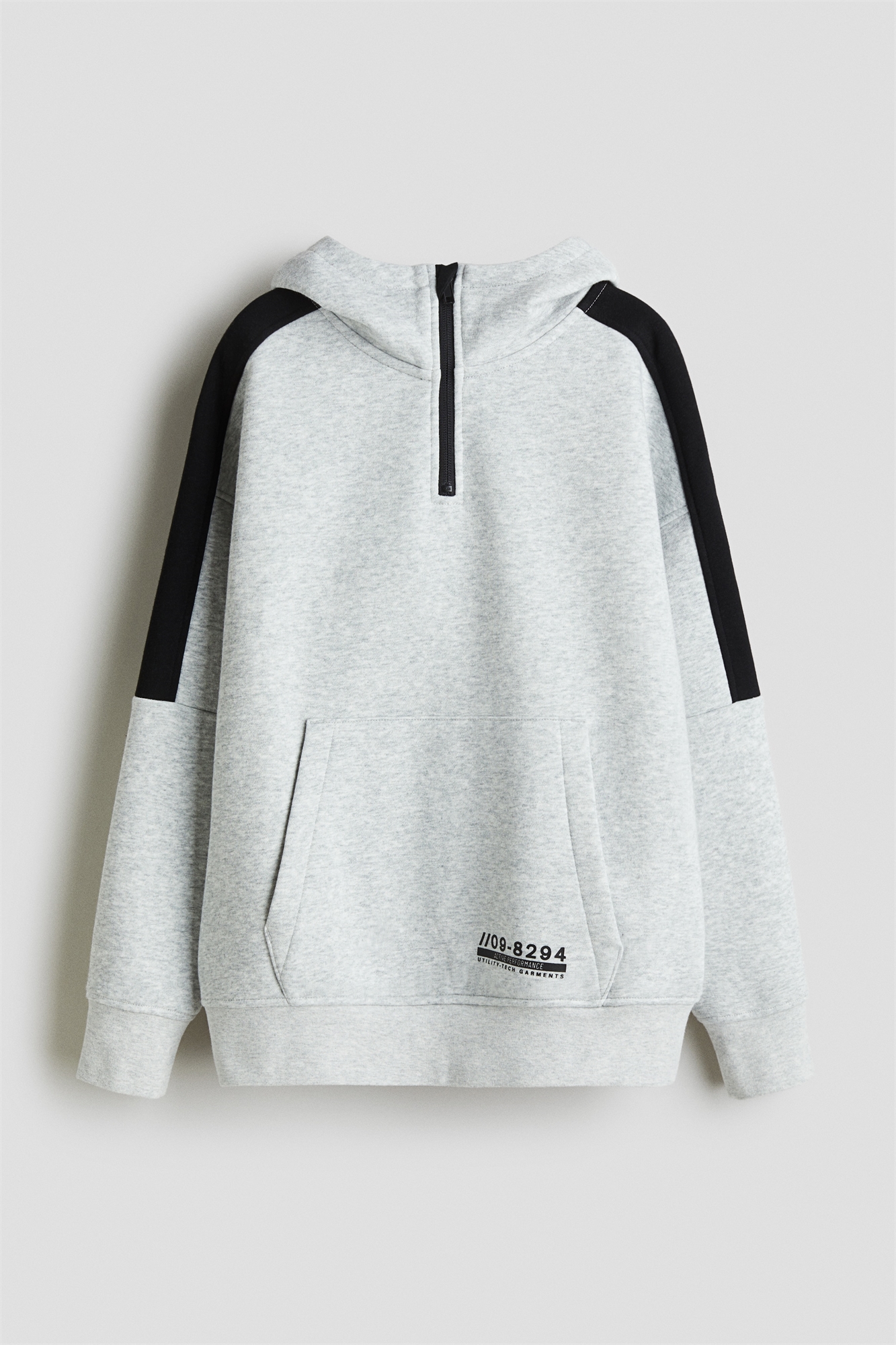 Толстовка свободного кроя из толстовочной ткани с мягкой ворсистой внутренней стороной и небольшим принтом. Капюшон на трикотажной подкладке, воротник-стойка спереди, застежка-молния сверху, спущенные плечи и карман-кенгуру. Ребристые манжеты и подол.
