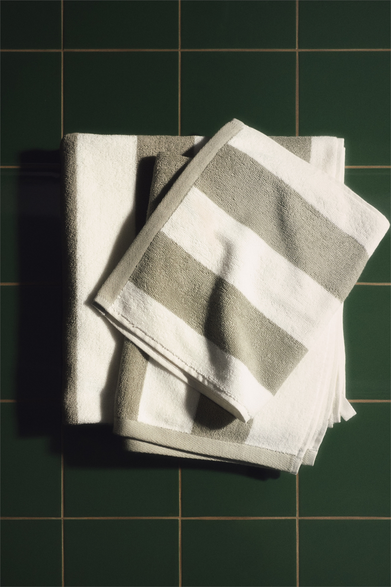 Полотенце для гостей из мягкой хлопковой махры с полосатым узором и вешалкой на одной короткой стороне. 480 GSM.