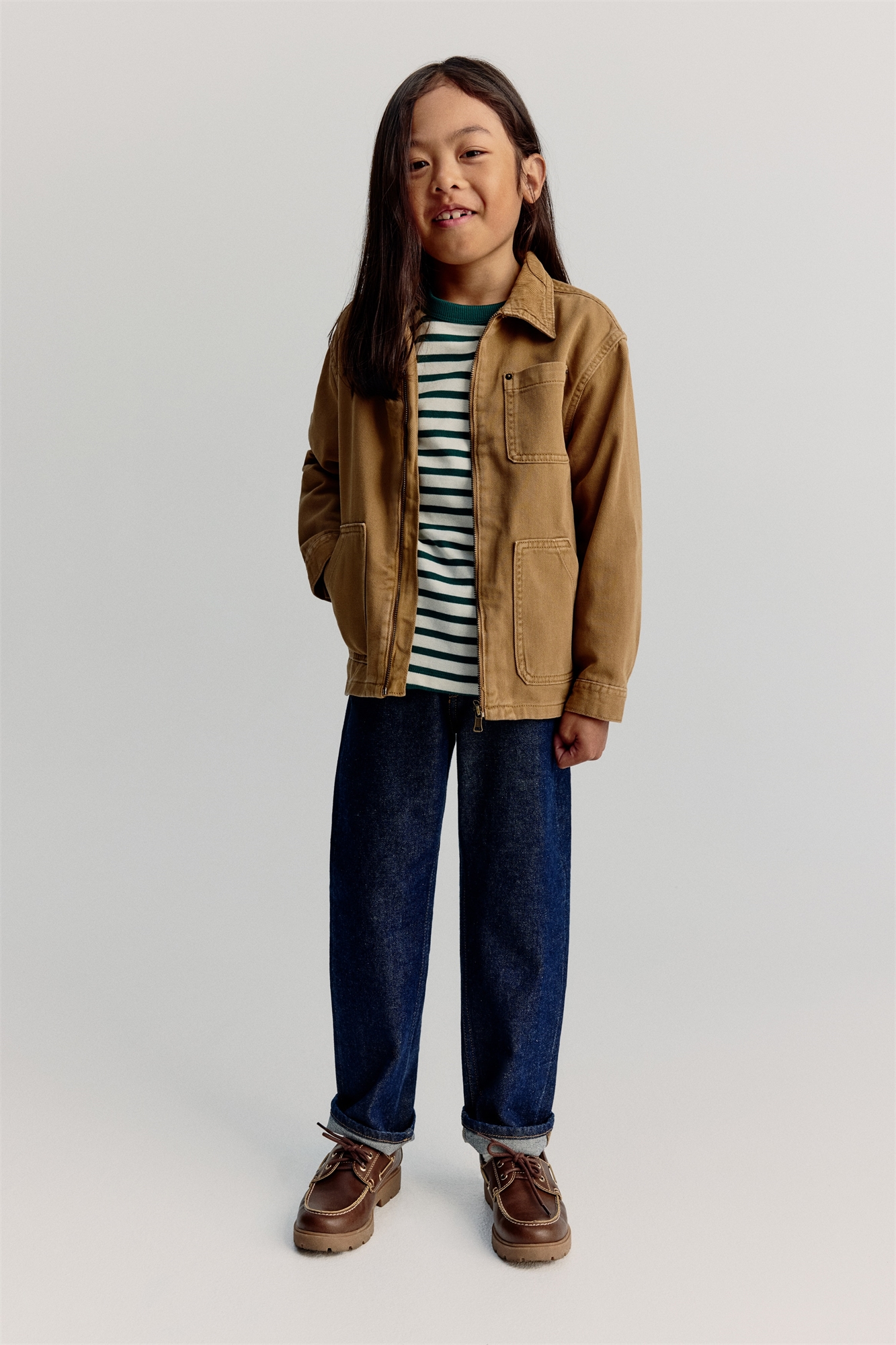 Куртка-рубашка из мягкой хлопковой саржи с отложным воротником из хлопкового вельвета. Застежка-молния спереди, защита подбородка от натирания, накладные карманы спереди и ярмо сзади. Спущенные плечи и длинные рукава с манжетами на кнопках. Без подкладки.