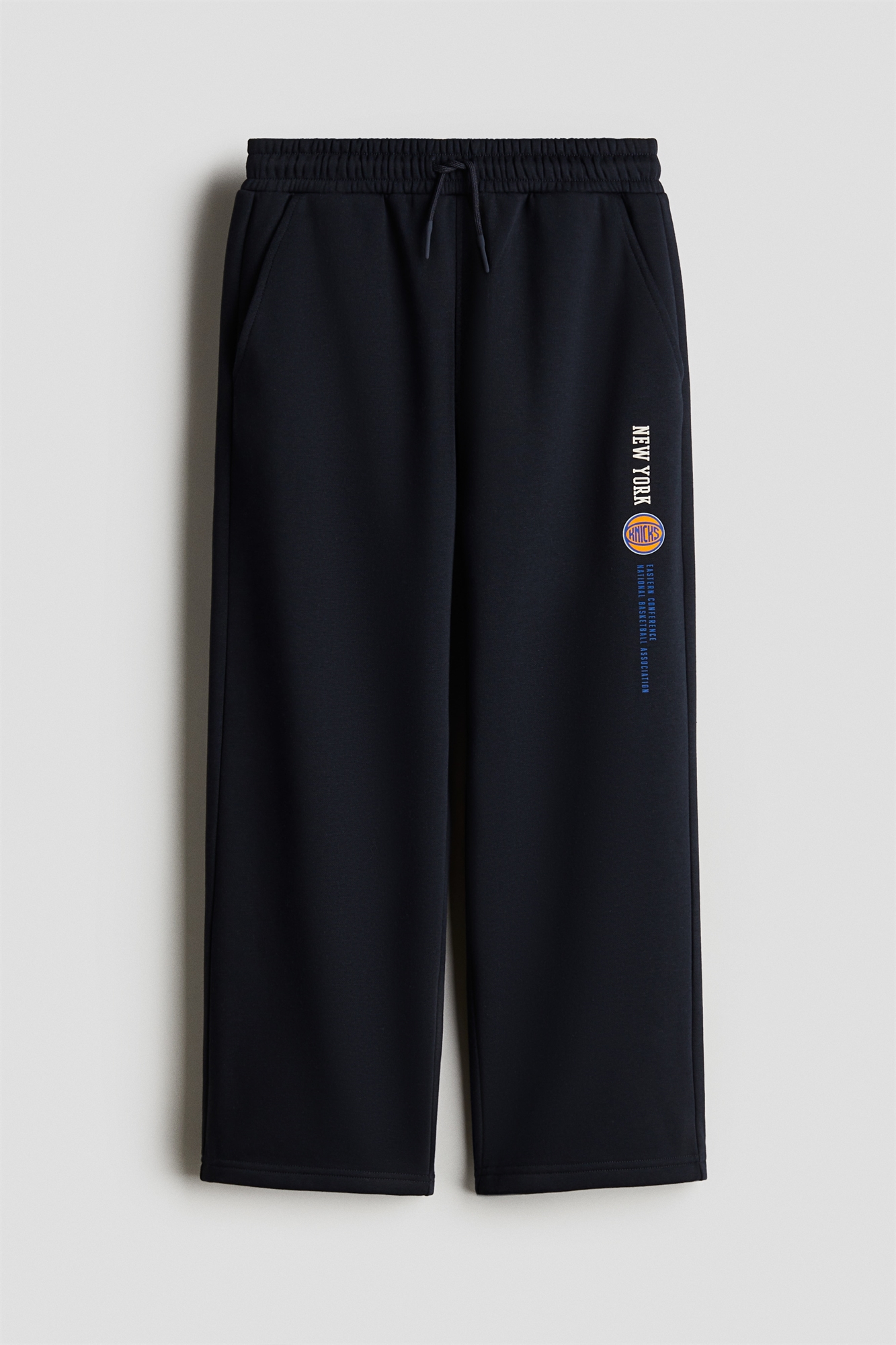 Джоггеры из толстовочной ткани с мягкой начесом внутри и принтом. Свободный крой с широкими ногами. Эластичный пояс с завязками, диагональные боковые карманы и открытый задний карман.