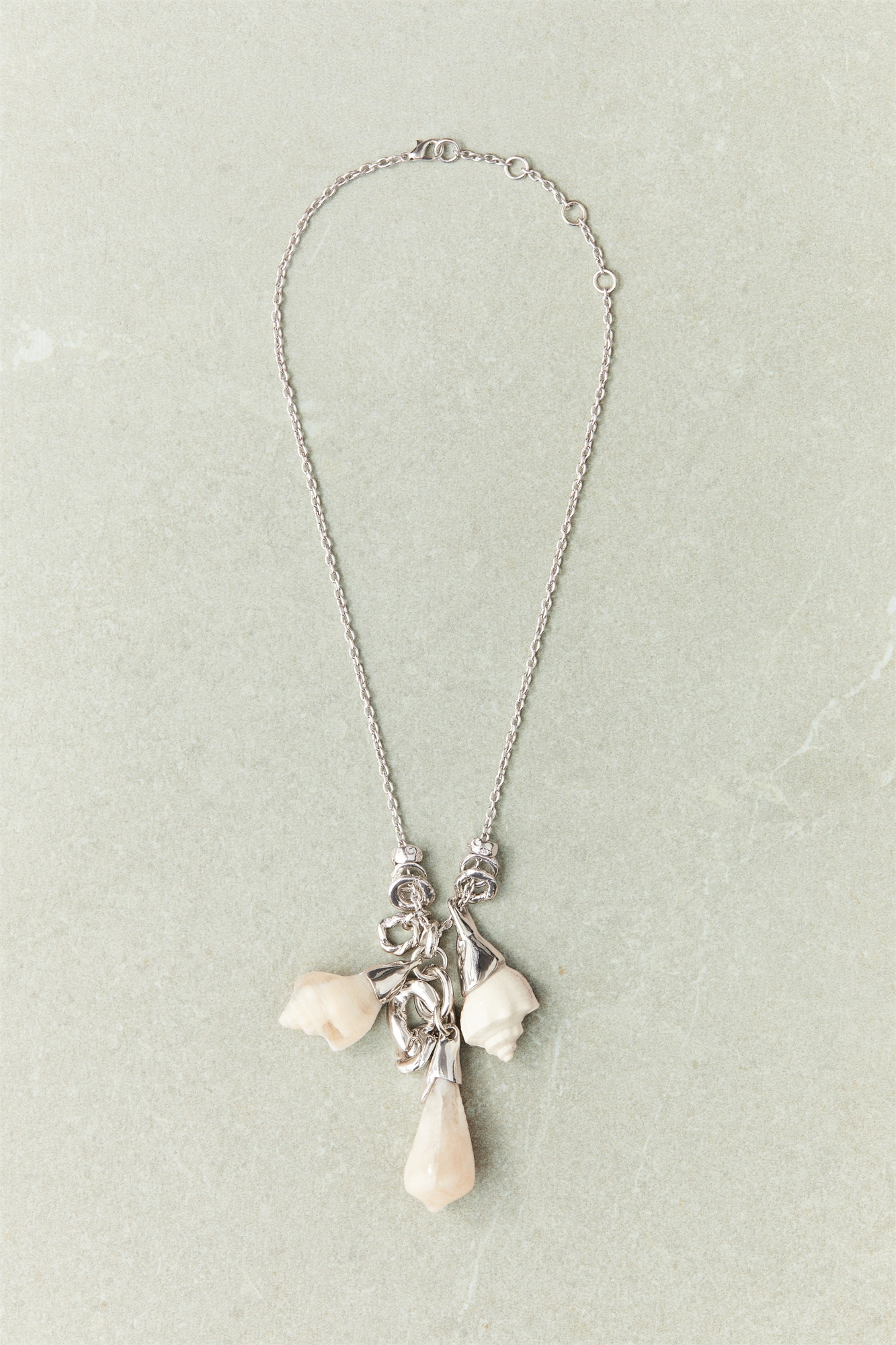 Ожерелье из металлической цепочки, украшенной металлическими звеньями и пластиковыми подвесками в форме ракушек. Регулируемая длина с застежкой-триггером.
