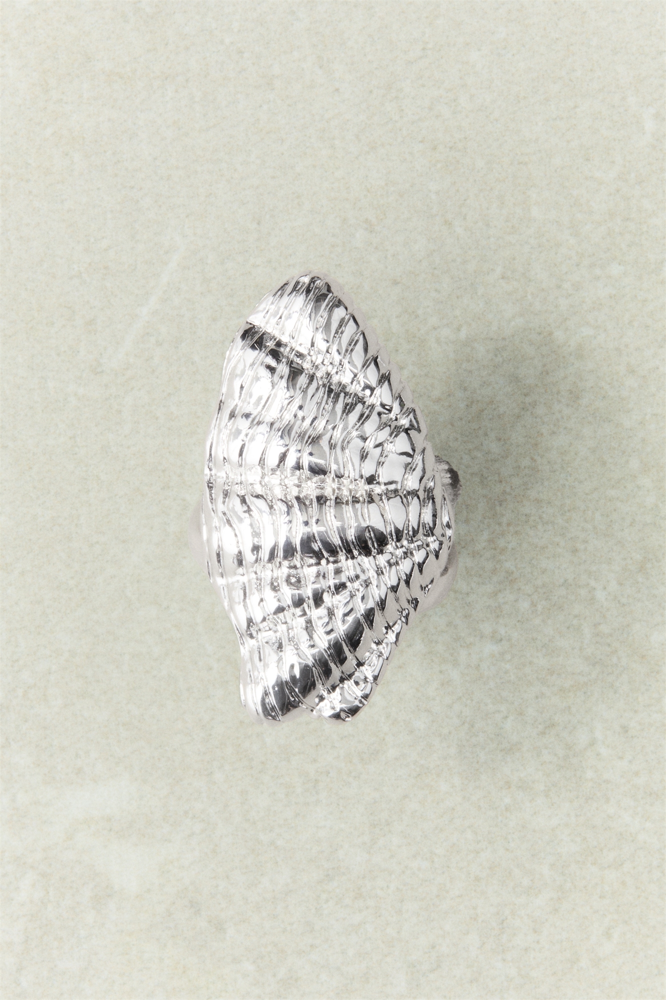 Металлическое кольцо в форме морской раковины с фактурной поверхностью.