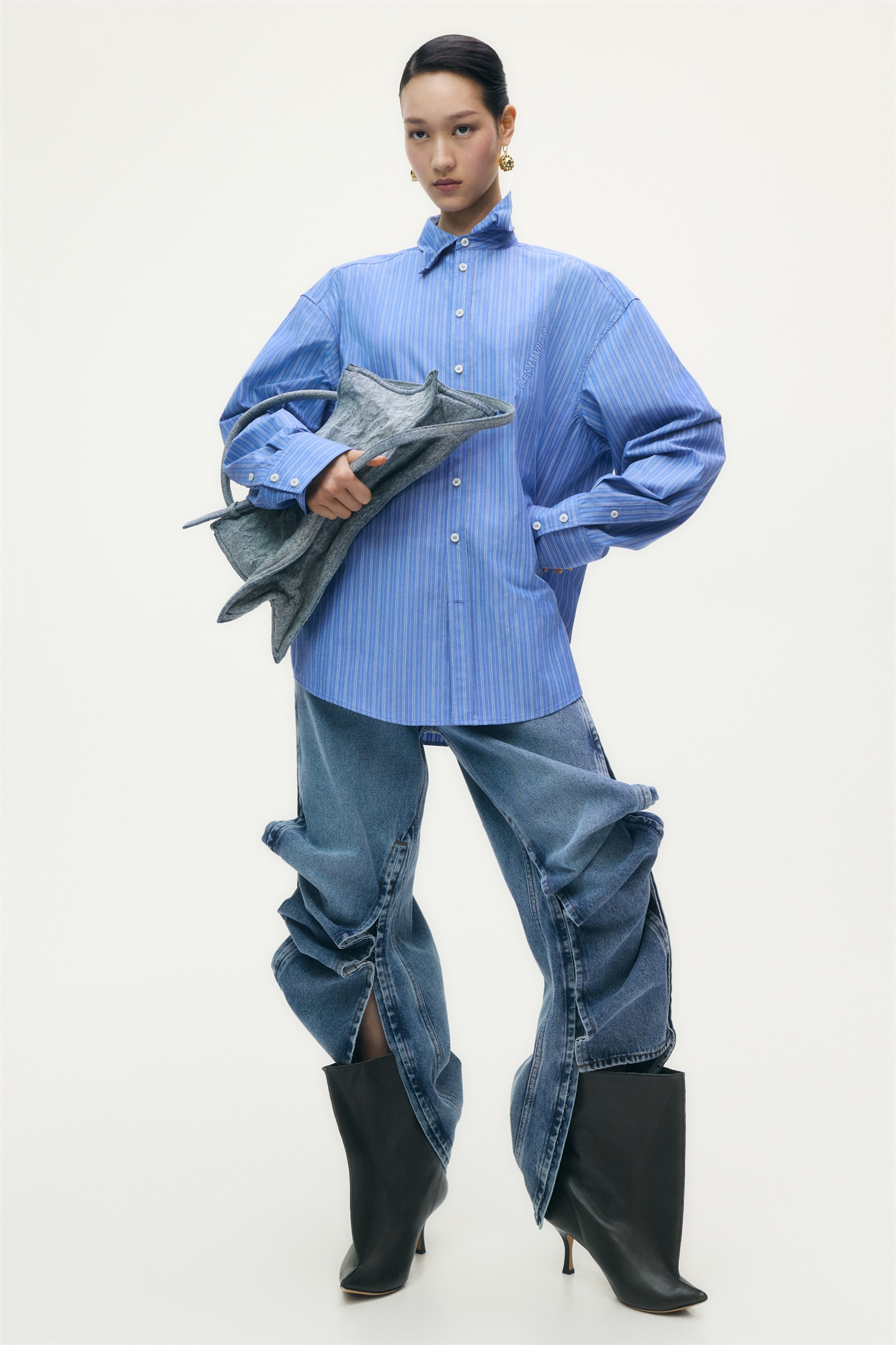 Свободная рубашка из хлопкового поплина с воротником и проволочными косточками по краям, которые придают ей структурность и позволяют придать мятый, деформированный вид. На груди вышит логотип дизайнера, а сзади - двухслойное ярмо с коробчатой складкой. Спущенные плечи и длинные рукава с манжетами на пуговицах и рукавной планкой с пуговицей. Изогнутый подол.