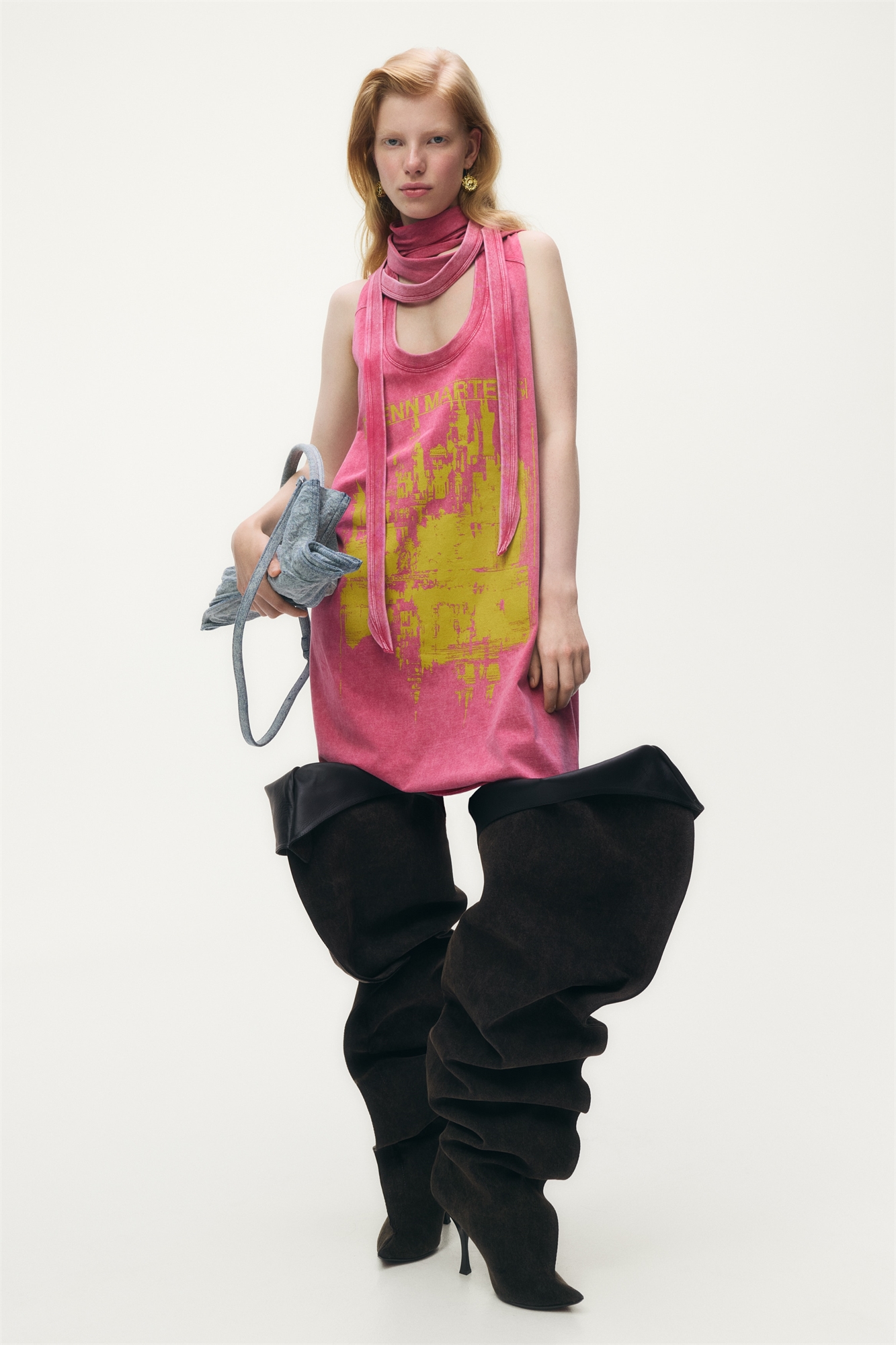 Мини-платье без рукавов из хлопкового джерси с мокрой поверхностью и принтом в виде логотипа дизайнера спереди. Свободный крой с круглым вырезом, глубокими проймами и завязками на плечах, которые можно завязывать или укладывать на шее различными способами.
