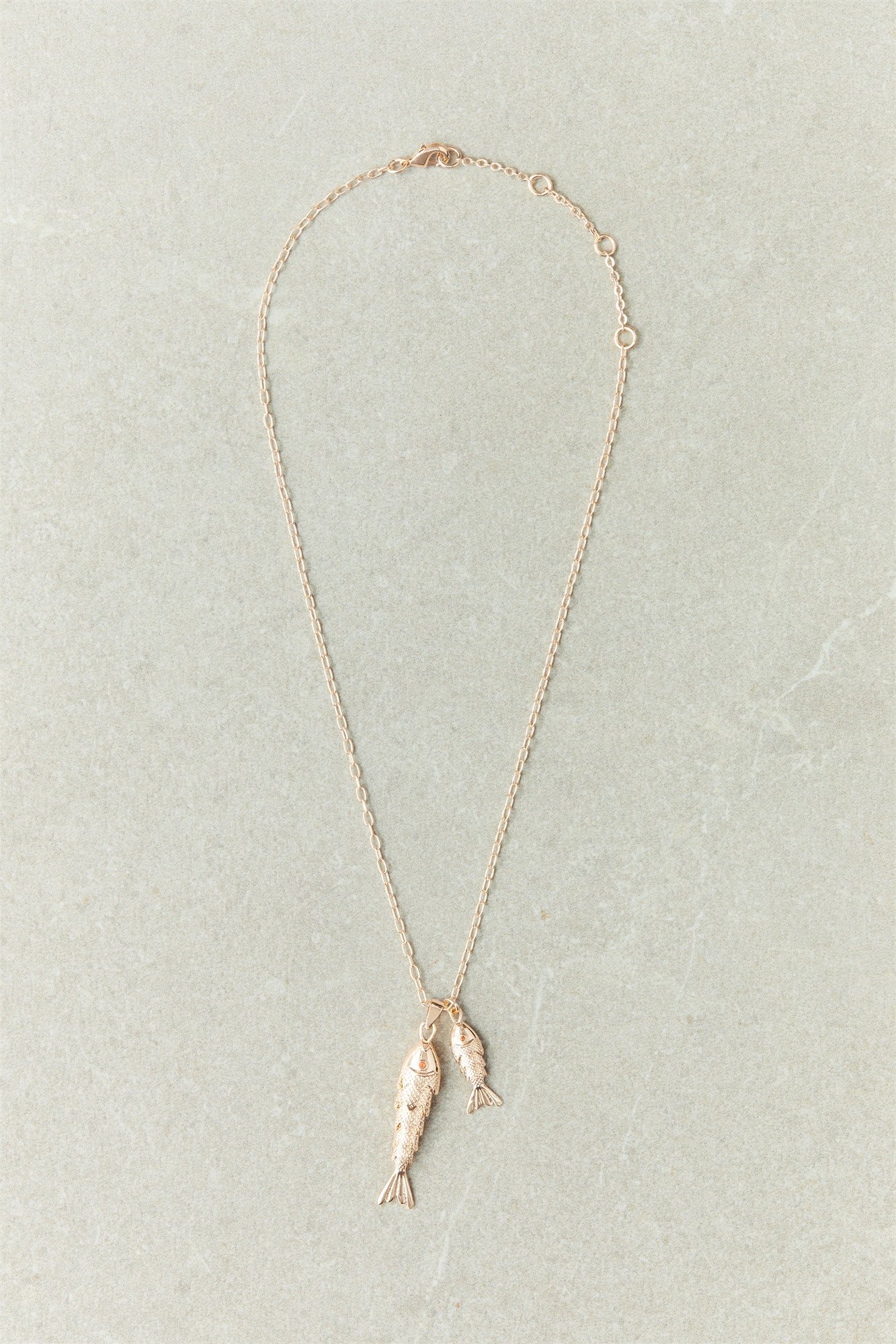 Ожерелье на металлической цепочке, украшенное подвесками в форме рыб разных размеров. Регулируемая длина с застежкой-триггером.