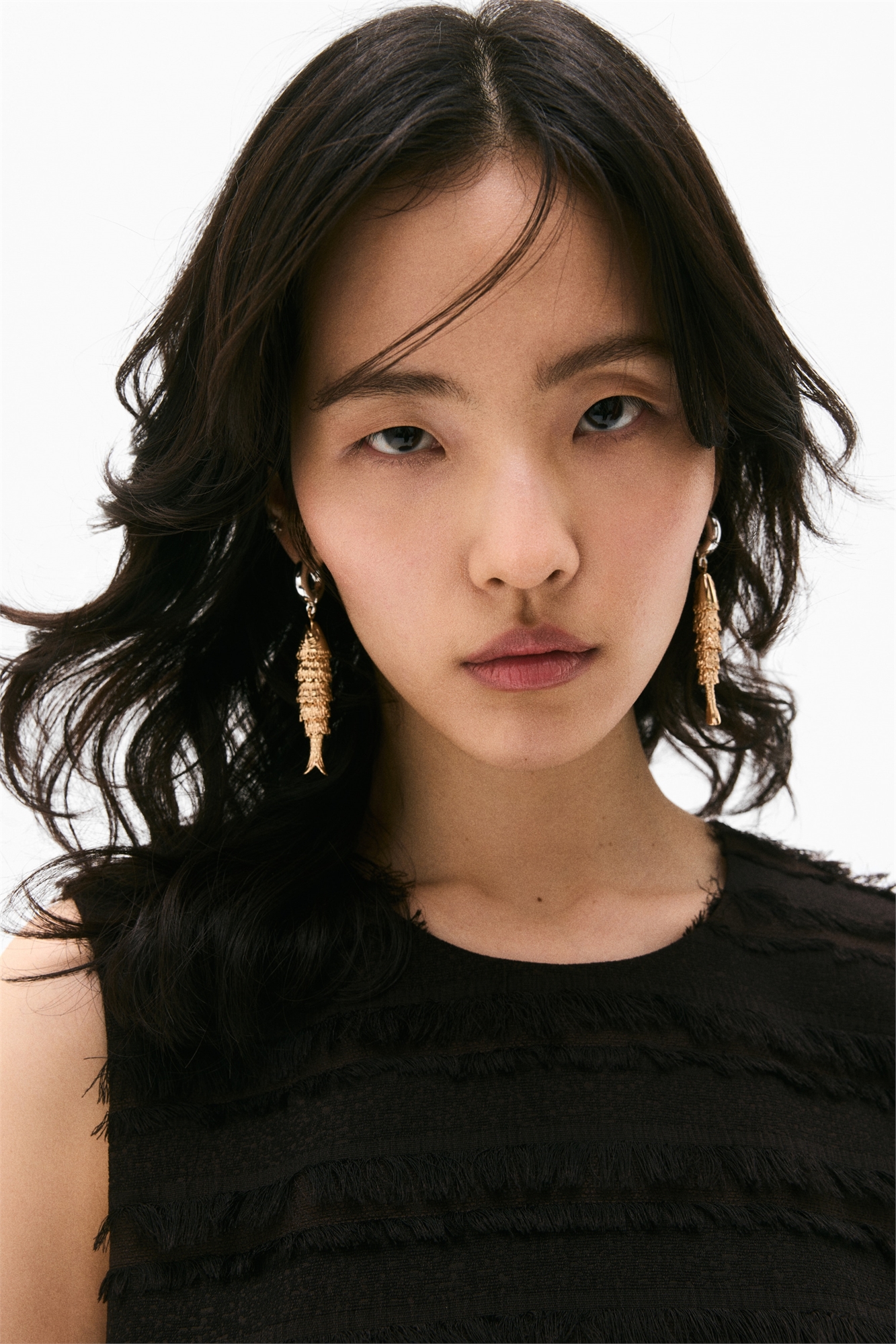 Двухцветные металлические серьги-обручи, украшенные подвеской в форме рыбы. Многослойный дизайн создает завораживающее движение, добавляя шарм любому наряду.