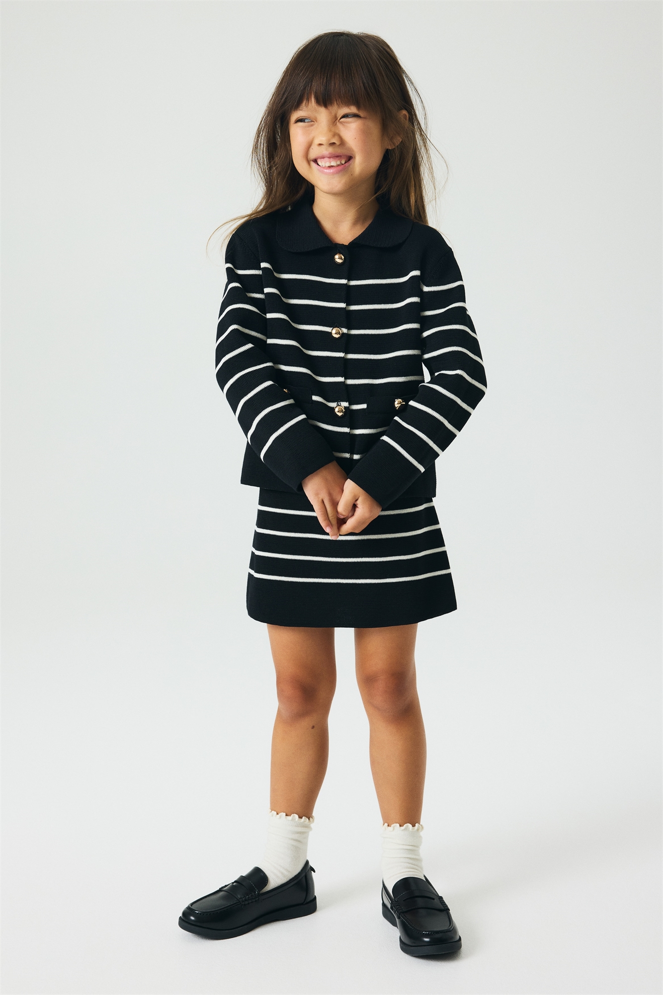 Комплект из мягкого тонкого трикотажа с кардиганом и юбкой в тон. Кардиган с длинными рукавами, округлым воротником и блестящими металлическими пуговицами спереди. Юбка А-линии со скрытой эластичной резинкой на талии. И кардиган, и юбка имеют декоративные накладные карманы спереди, застегивающиеся на металлическую пуговицу.