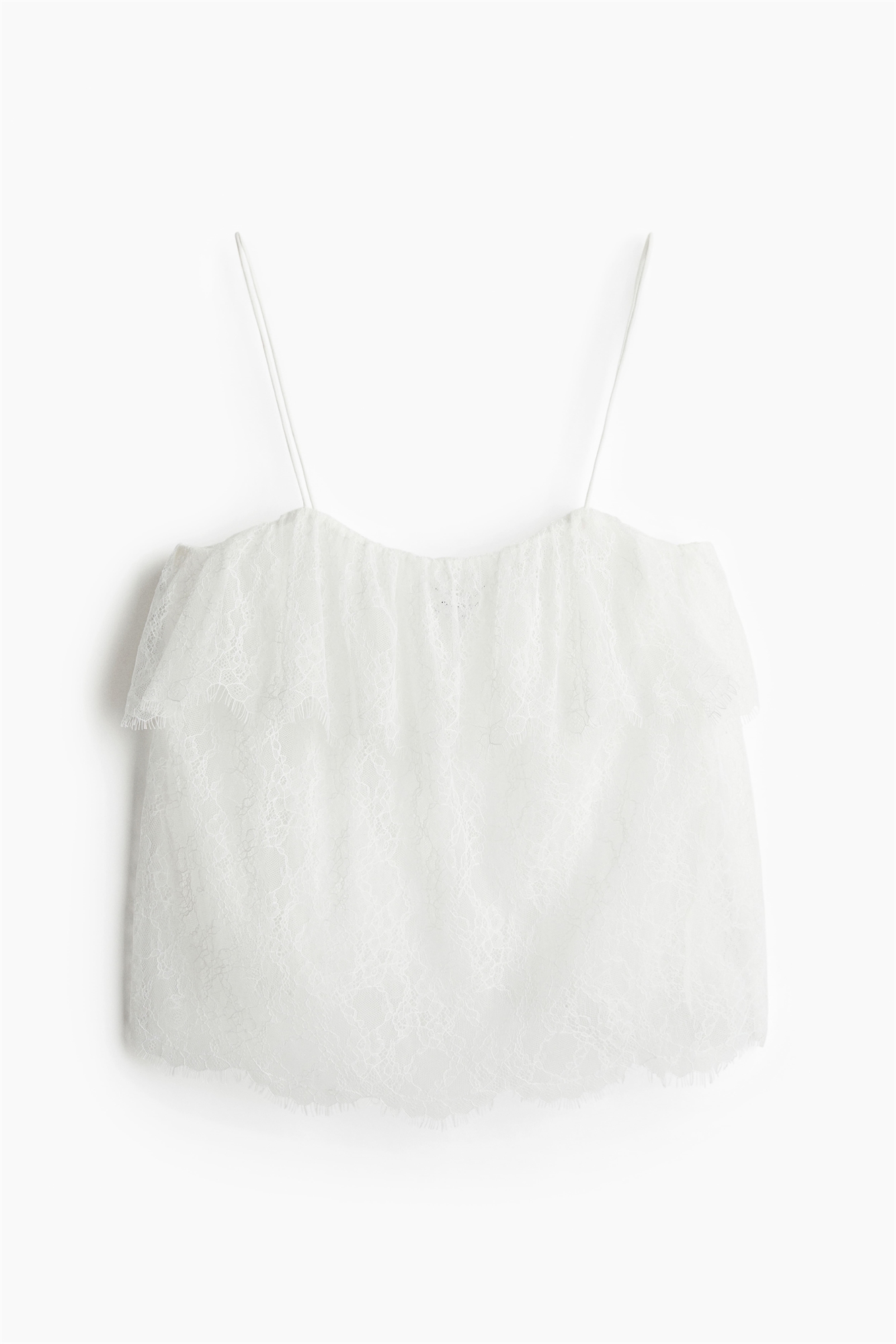 Топ из кружева с бретельками-спагетти и прямым вырезом с гребешковым воланом. Гребешковый край по подолу. Без подкладки.
