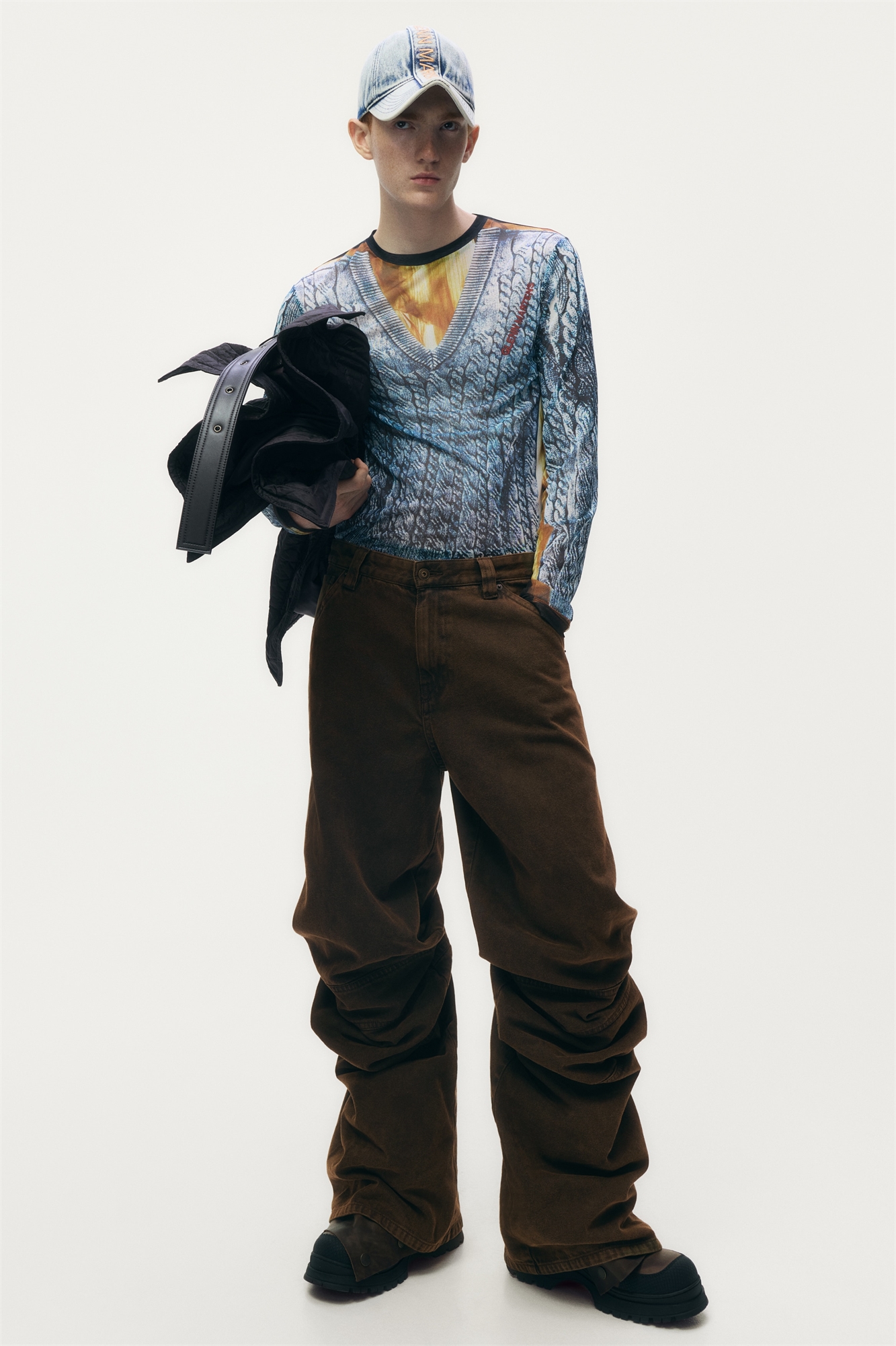 Свободные брюки из жесткой хлопковой саржи с эффектом стирки. Мешковатый крой с дополнительными панелями на коленях, которые спереди складываются в свободные складки, а сзади собираются и закрепляются горизонтальными швами, создавая по-настоящему сутулый силуэт. Регулярная талия с ширинкой на молнии и пуговице и опущенной промежностью. Карманы спереди и сзади, накладной карман и петля для молотка на одной штанине.