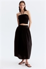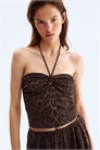 Короткий приталенный топ из фактурного джерси с перекрученной частью по центру бюста и узкими завязками по линии талии с бусинами на концах.