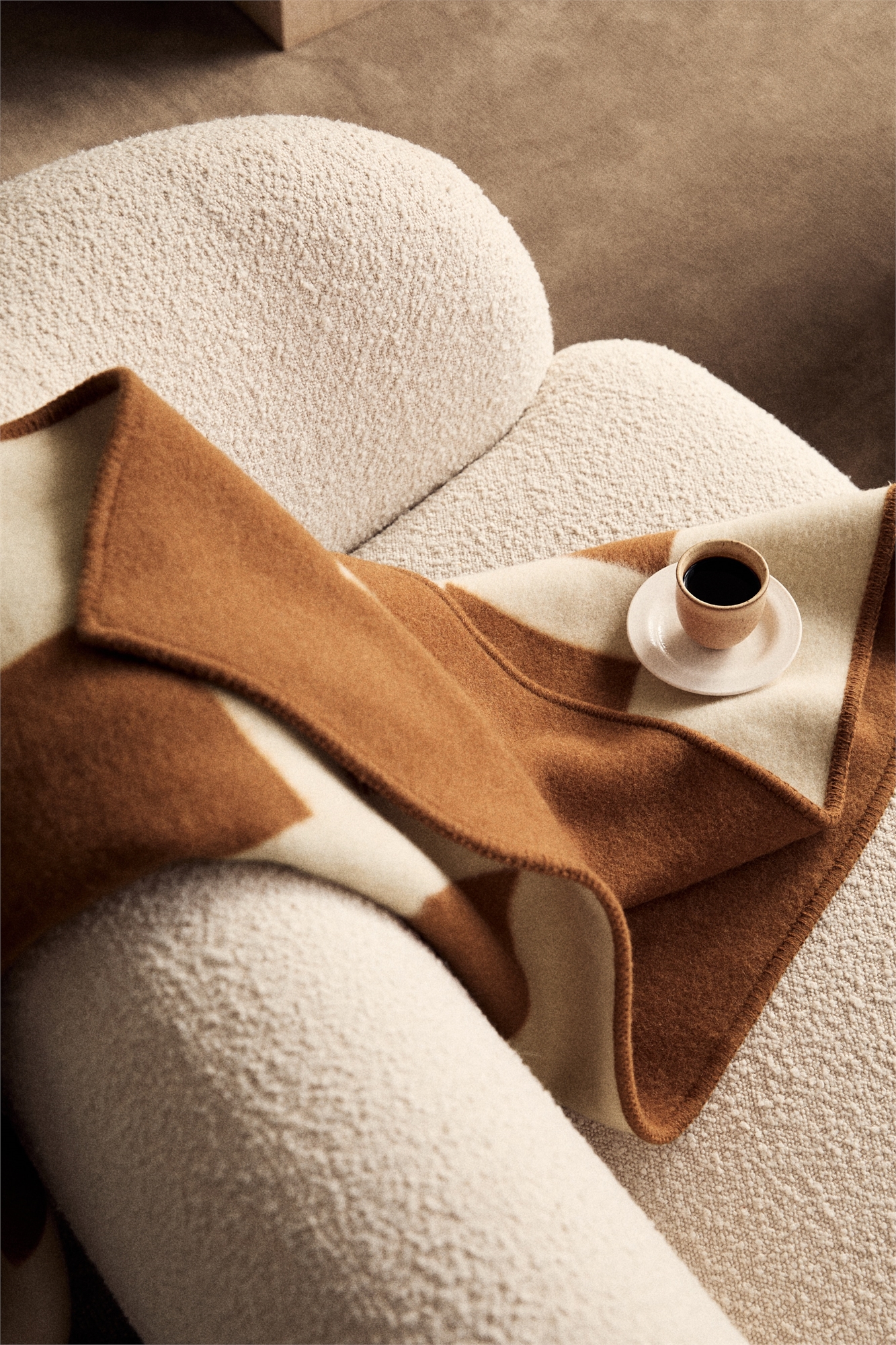 Толстый плед из шерстяной смеси с ярким жаккардовым узором. По краям отделано стежкой в виде одеяла.
