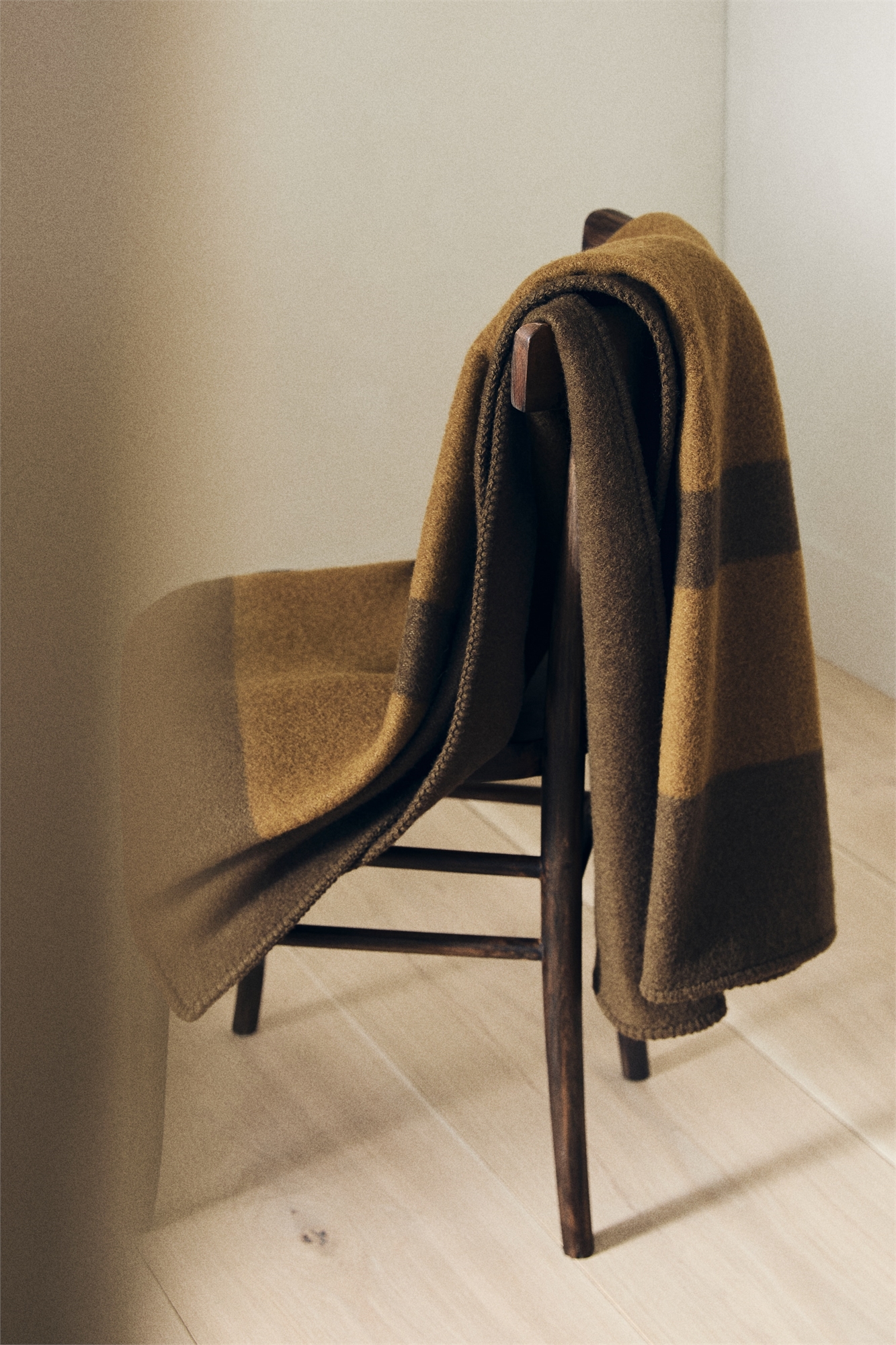 Толстый плед из шерстяной смеси с ярким жаккардовым узором. По краям отделано стежкой в виде одеяла.