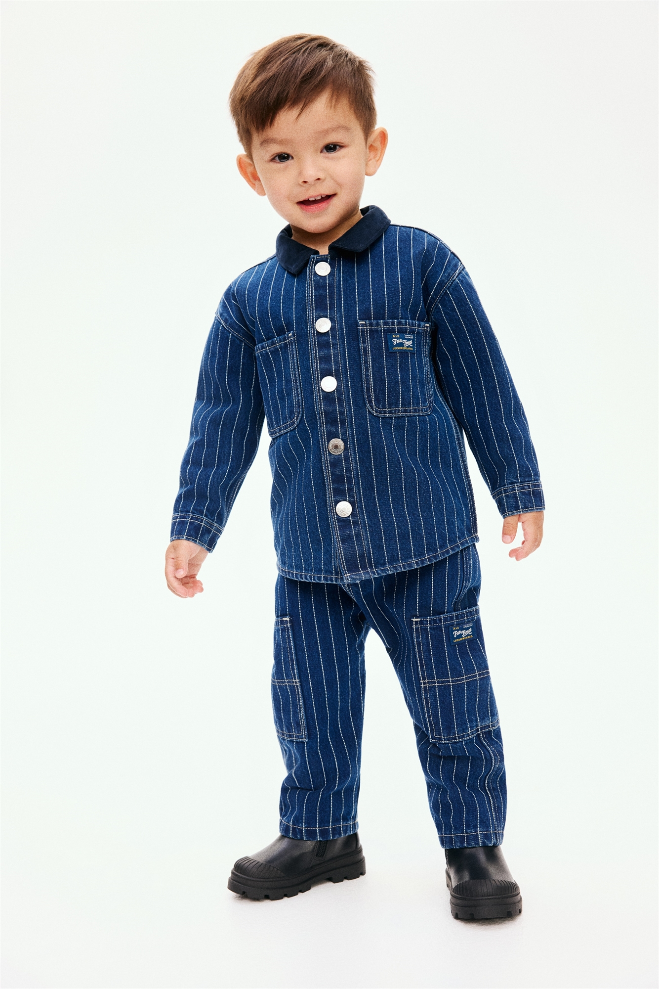 Джинсы из хлопкового денима в полоску с контрастными цветными швами. Регулируемый, эластичный пояс и ширинка на молнии с кнопкой. Поддельные передние карманы, накладные карманы на ногах и сзади.
