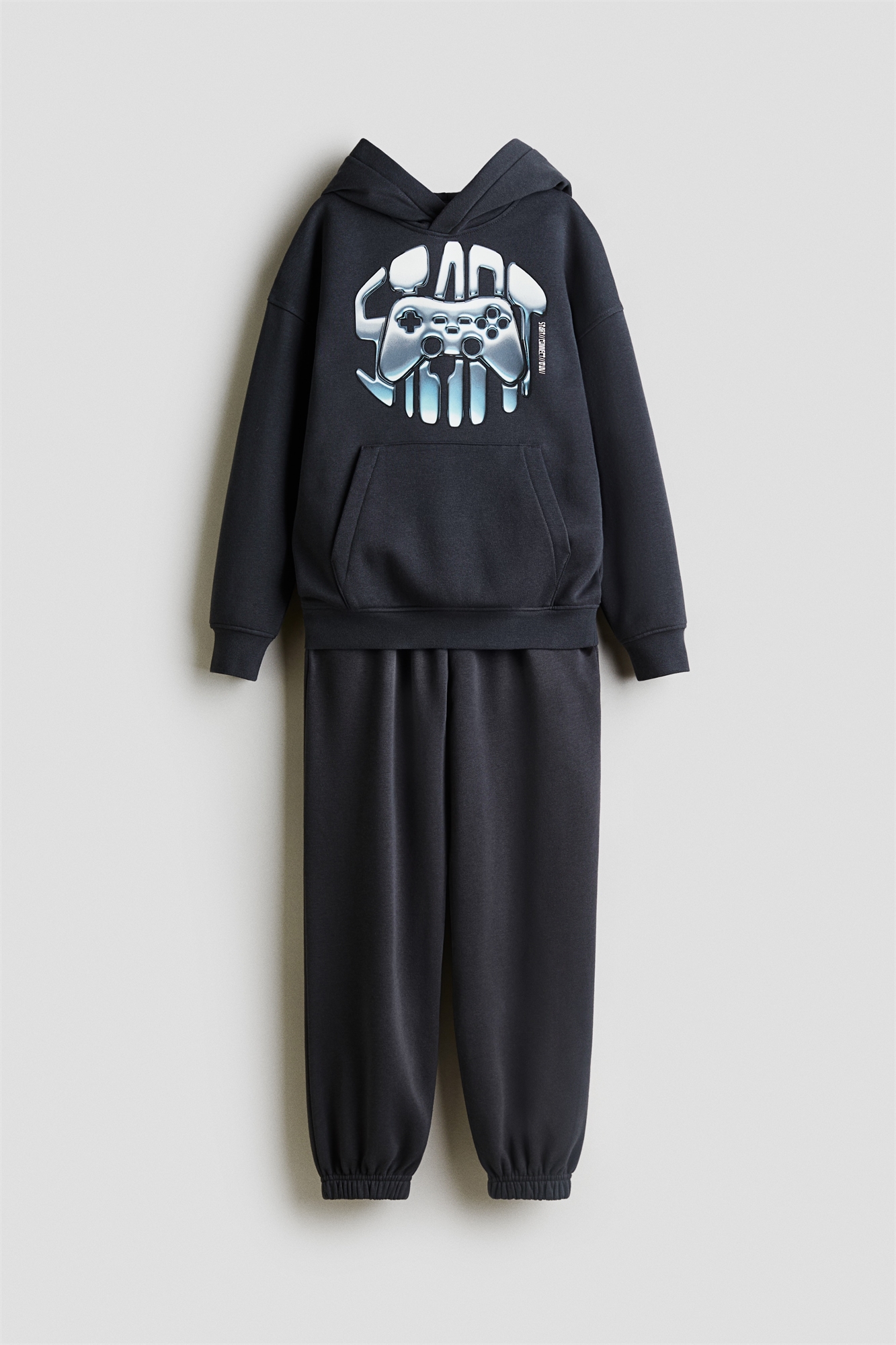 Комплект из толстовки и джоггеров из принтованной толстовки с мягкой ворсистой внутренней стороной. Толстовка с капюшоном, накинутым на плечи, длинными рукавами и карманом-кенгуру. Ребристые манжеты и подол. Джоггеры с эластичным утягивающим поясом, боковыми карманами и одним задним карманом. Эластичная резинка на подоле.