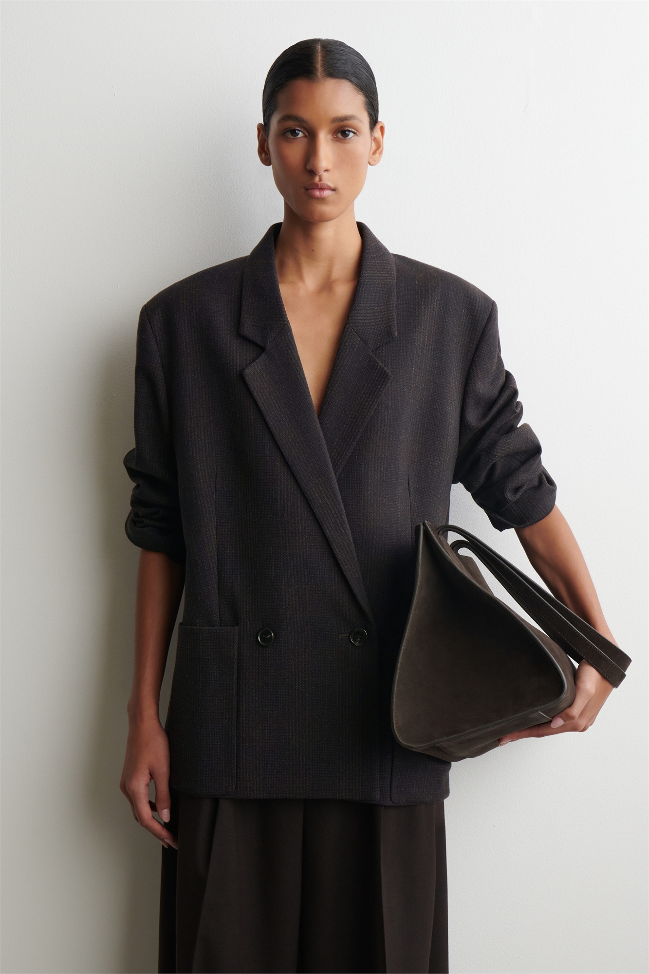 Коллекция осень-зима 2025 года представляет собой новую интерпретацию классики. Этот двубортный блейзер изготовлен из нелиняющей шерстяной смеси и украшен узором в клетку "Принц Уэльский" в различных оттенках коричневого. Модель имеет слегка приталенный крой, талиевые вытачки и накладные карманы большого размера спереди. Регулярная посадкаПуговицыОрганический хлопок - это хлопок, выращенный без использования синтетических пестицидов и удобрений и не содержащий генетически модифицированных организмов Внешняя ткань: 58% органического хлопка, 22% шерсти RWS, 20% переработанной шерсти. Подкладка: 100% вискоза. Подкладка карманов: 100% хлопок. Детали исключены/Сухая чистка Длина по спинке в размере ЕС 36 = 70,1 см/Модель носит размер ЕС 36