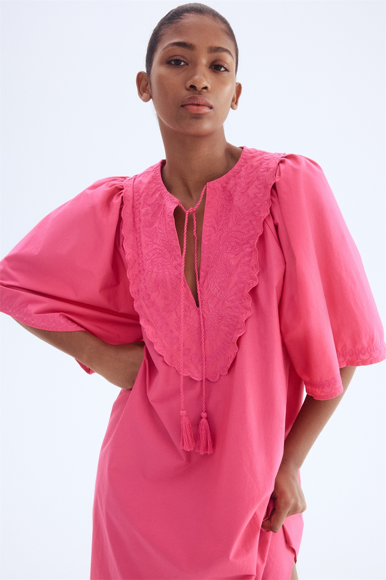 Короткое платье свободного покроя из хрустящего хлопкового поплина с круглым вырезом с V-образной проймой и завязками с кисточками спереди. Вышитый передний ярморок с гребешковым краем и широкие рукава длиной до локтя с вышивкой на манжетах. Без подкладки.