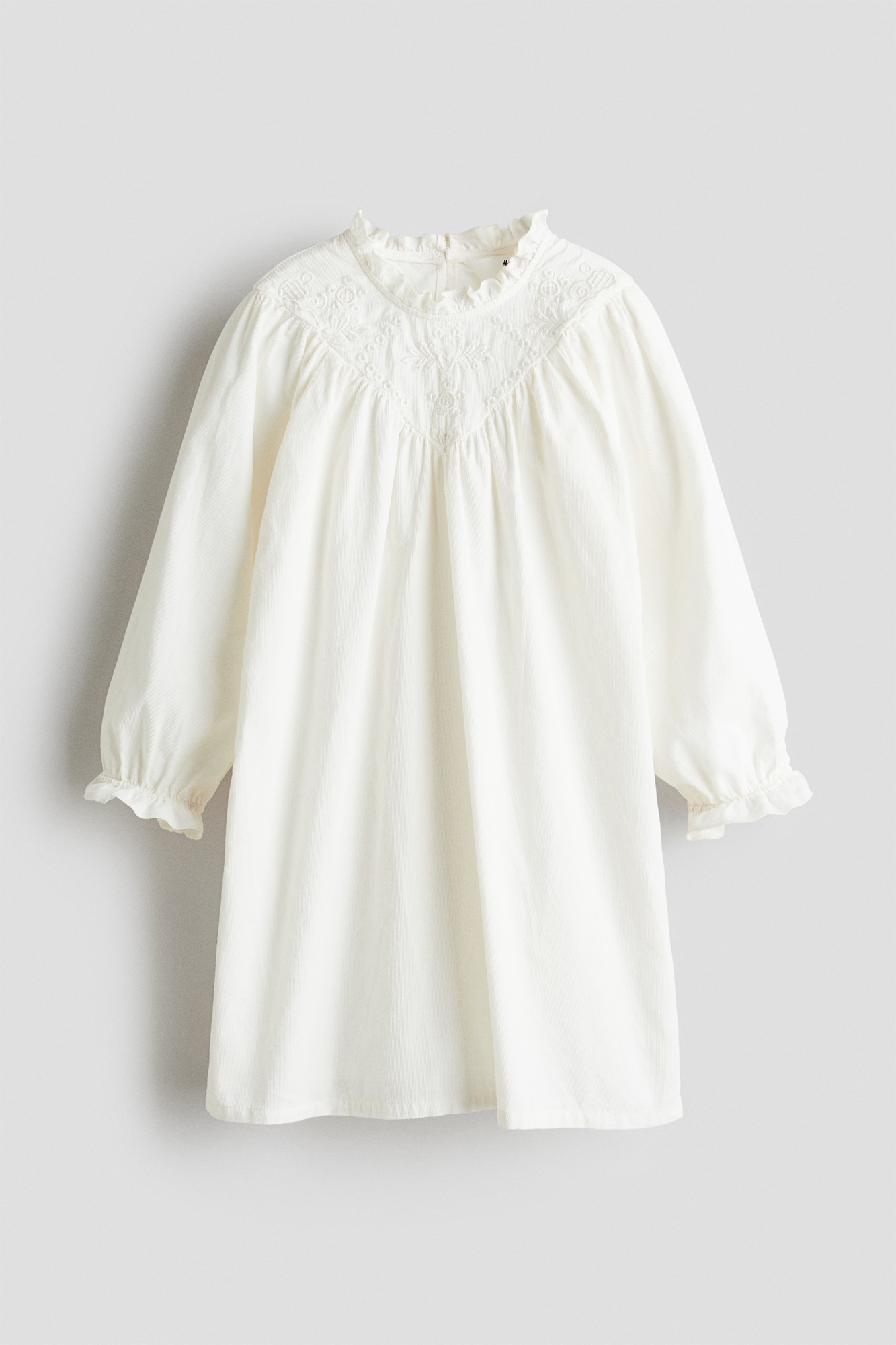 Платье из мягкого хлопкового вельвета. Небольшой воротник с оборками, отверстие для ключа с пуговицей сзади, V-образный нагрудник спереди и ярмо сзади. Длинные рукава с эластичными манжетами с оборками.