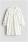Платье из мягкого хлопкового вельвета. Небольшой воротник с оборками, отверстие для ключа с пуговицей сзади, V-образный нагрудник спереди и ярмо сзади. Длинные рукава с эластичными манжетами с оборками.