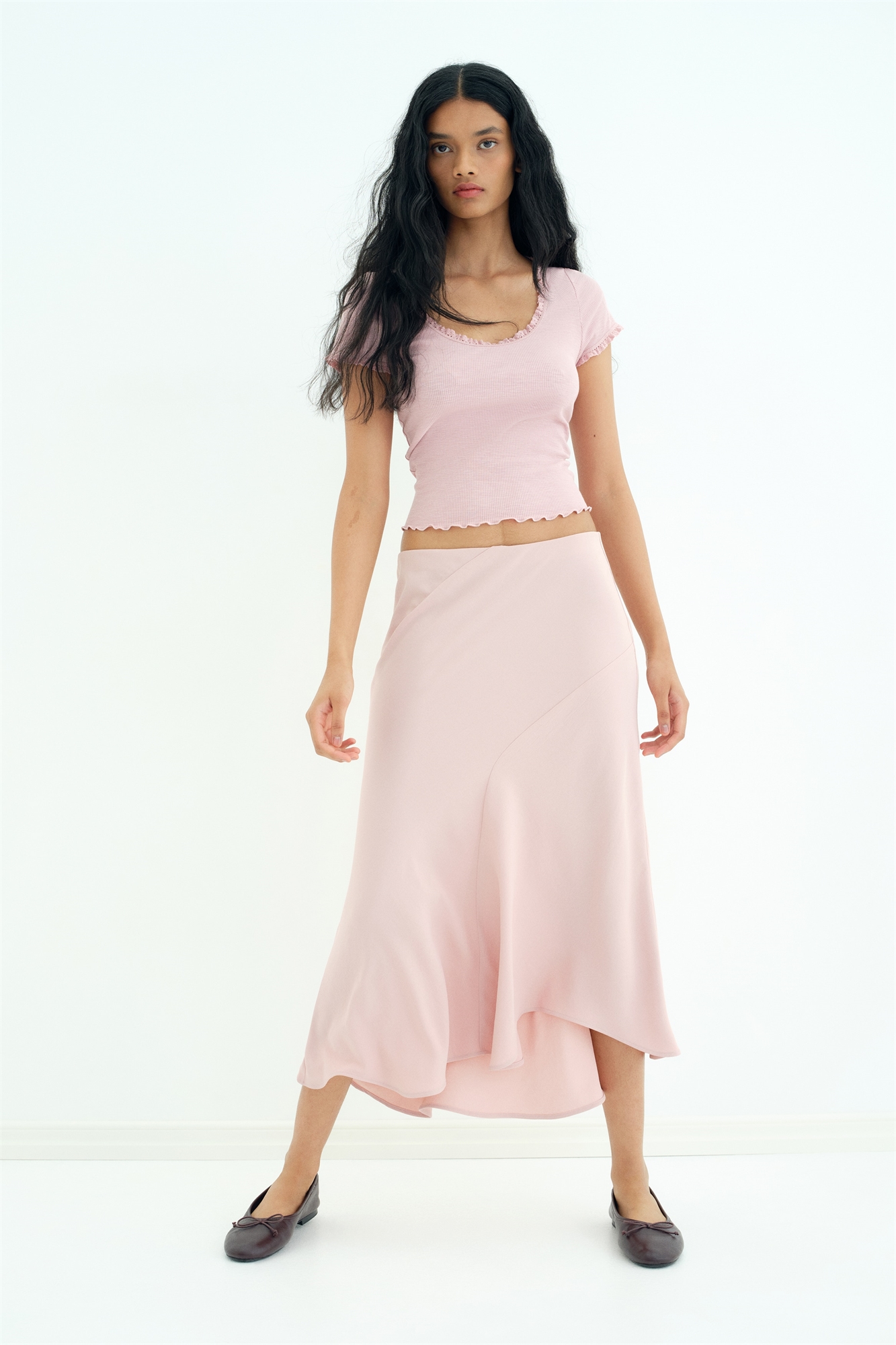 Юбка длиной до колен из тканого материала с эластичным поясом и диагональными швами, начинающимися спереди и сзади от талии и продолжающимися до колен. Расклешенный, асимметричный подол.