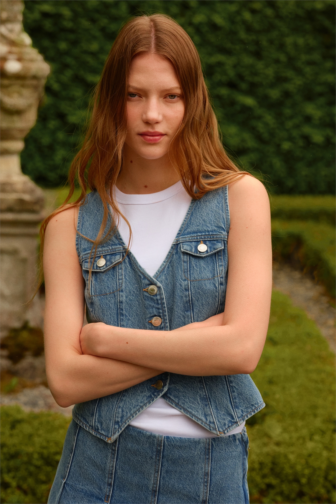 Приталенный жилет из плотного хлопкового денима с V-образным вырезом. Пуговицы спереди, декоративные накладные карманы на пуговицах на груди и зауженная талия. Регулируемая застежка с металлической пряжкой сзади на талии.