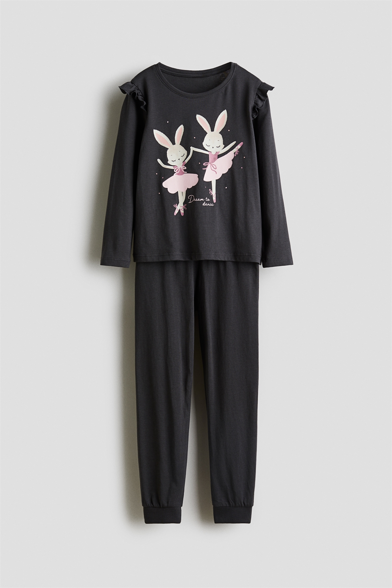 Пижама с набивным верхом и низом из мягкого хлопкового джерси. Верхняя часть с длинными рукавами, круглым вырезом и оборкой на плечах. Нижние штанишки с эластичной резинкой на талии и ребристыми краями.
