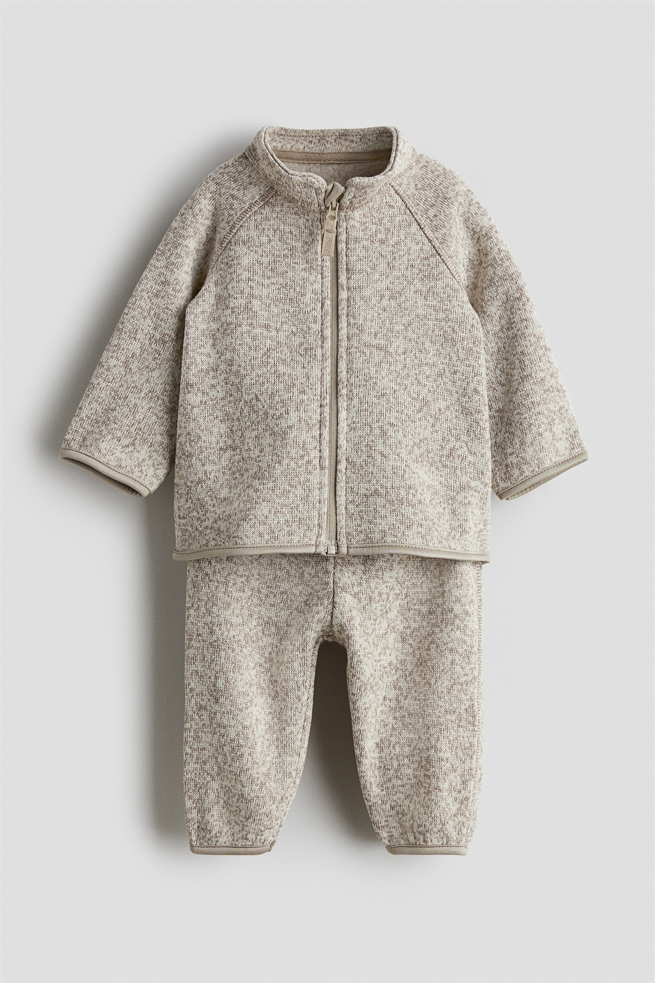 Комплект из мягкого флиса, который можно носить как сам по себе, так и в качестве утепляющего слоя. Куртка с воротником-стойкой, застежкой-молнией спереди, защитой подбородка от натирания и длинными рукавами реглан. Манжеты и подол отделаны джерси. Брюки с регулируемой эластичной талией и отделкой джерси по подолу.