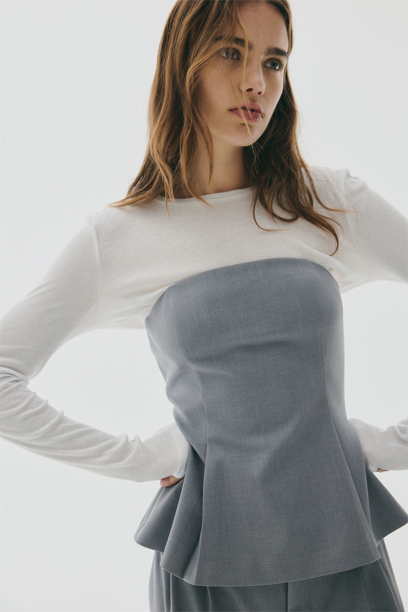 Облегающий топ-бюстье из тканого материала с потайной застежкой-молнией сзади. Формирующие швы спереди и сзади переходят в ножевые складки на талии, создавая расклешенный силуэт. Аккуратный закругленный подол.