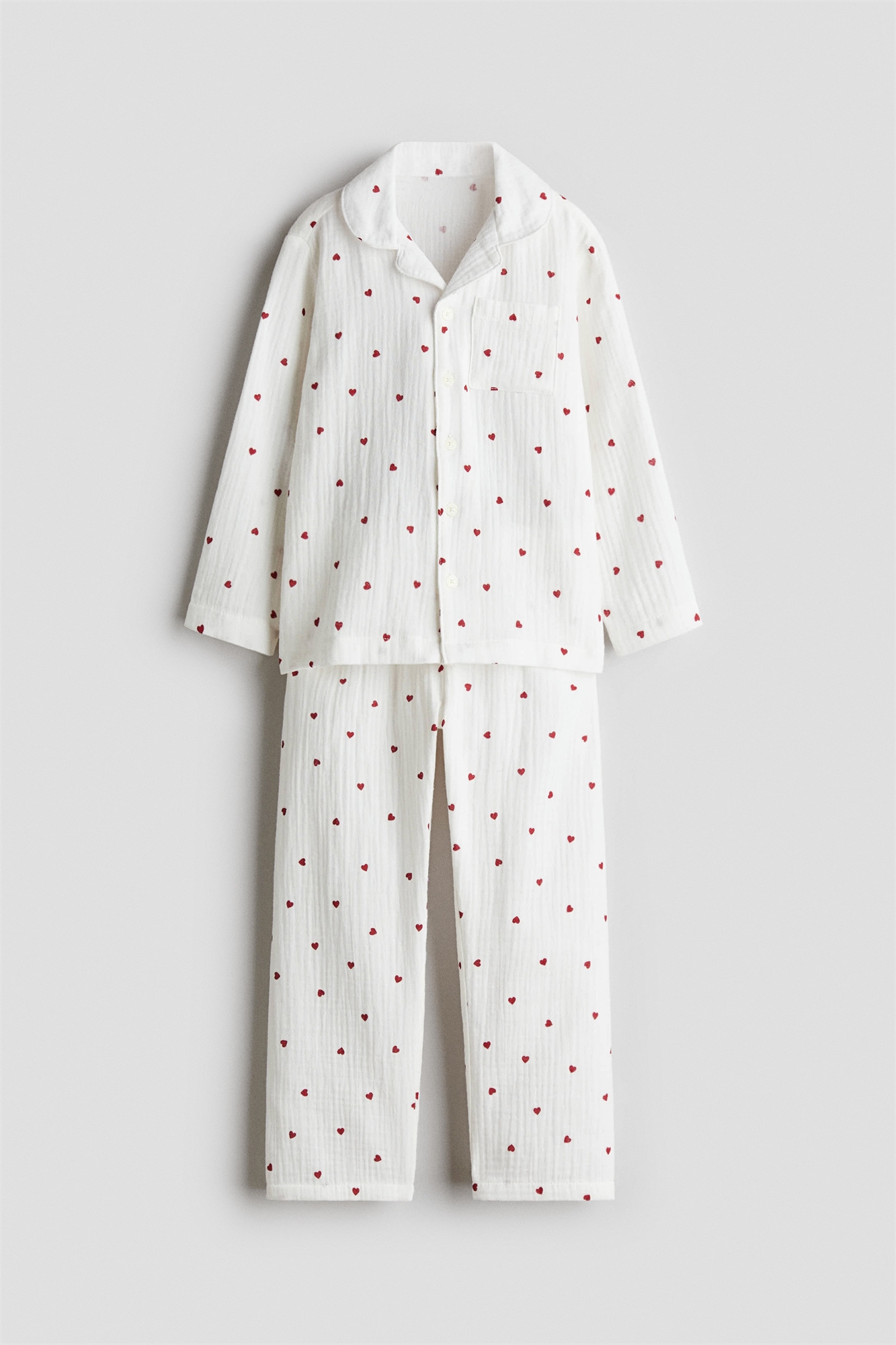 Пижама из мягкого хлопкового муслина с рубашкой и нижней частью. Рубашка с длинными рукавами, отложным воротником, пуговицами спереди и нагрудным карманом. Низ с эластичной талией.